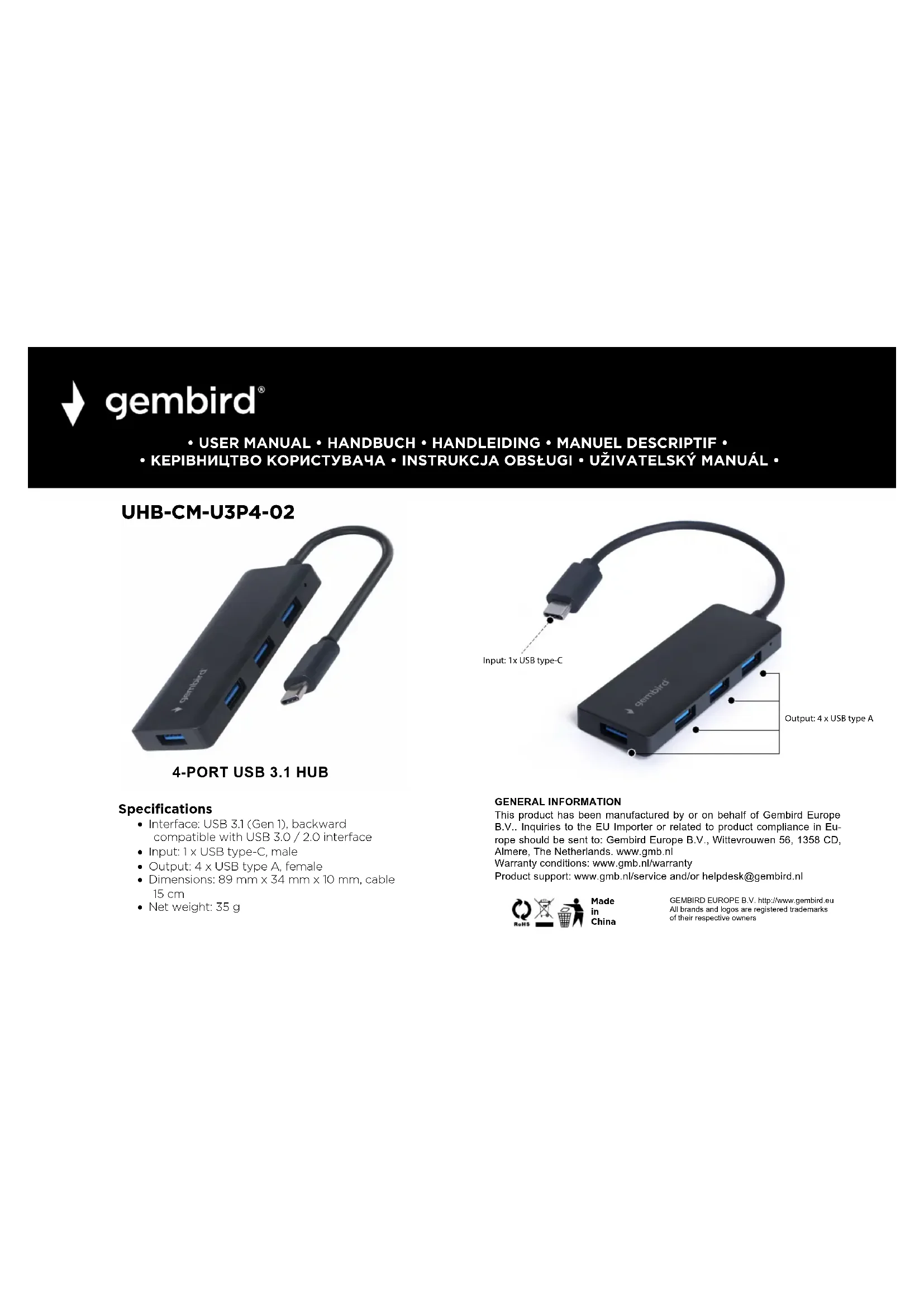 UHB-CM-U3P4-02 - USB hub Gembird - Notice d'utilisation et mode d'emploi gratuit