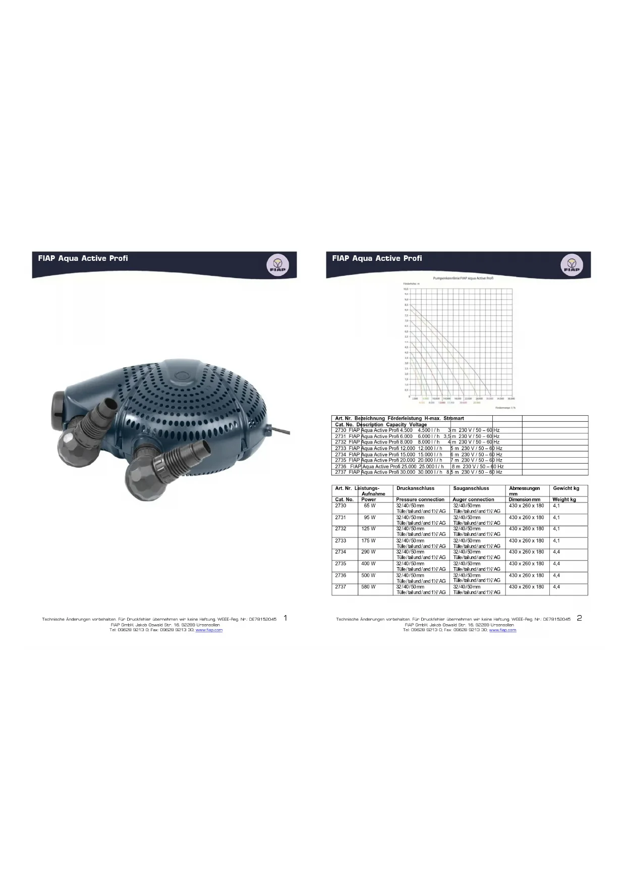 Technische Änderungen vorbehalten. Für Druckfehler übernehmen wir keine Haftung. WEEE-Reg. Nr.: DE78152045 10 FIAP GmbH, Jakob Oswald Str. 16, 92289 Ursensollen Tel: 09628 9213 0; Fax: 09628 9213 30; www.fiap.com techniques sur l’appareil. N’utiliser que des pièces de rechange et des accessoires d’origine. Ne faire effectuer les réparations que par le SAV autorisé. Ne jamais utiliser l’appareil sans débit d’eau! Ne jamais refouler des liquides autres que de l’eau! En cas de questions et de problèmes, prière de vous adresser à un électricien et ce, pour votre propre sécurité! Raccordement électrique Le raccordement électrique ne peut être effectué que par un spécialiste habilité selon les spécifications VDE et EVU. Pour toutes les installations, la directive VDE 0100 partie 702 est en vigueur. Toutes les données de puissance se trouvent sur la plaque signalétique. Pour tous les travaux à effectuer sur l’appareil, ce dernier doit être débranché! Mise en service Attention! Ne jamais utiliser l’appareil sans panier de filtration ni sans débit d’eau! Montage Retirer la prise de secteur et protéger l’appareil contre la remise en marche. Utiliser l’appareil uniquement en position horizontale et bien fixe sur une surface stable. L’appareil doit être positionné sous la surface de l’eau et peut être mis en place à l’intérieur du bassin (immergé) ou à l’extérieur de celui-ci (au sec). Mise en place à sec Ouvrir les enveloppes filtrantes, retirer la pompe, et monter ensuite la conduite d’aspiration et la conduite de pression. Les accessoires de montage à savoir les embouts à étages, les joints d’étanchéité et les colliers de serrage se trouvent dans le kit joint. Raccordement au filtre d’eau Fixer le tuyau (32/40/50 mm) sur l’embout à étages et, le cas échéant, le bloquer avec un collier de serrage, introduire l’embout à étages dans la sortie de la pompe, raccorder l’autre extrémité du tuyau au filtre d’eau. Raccordement au skimmer Placer l’écrou d’accouplement sur l’embout à étages, fixer le tuyau conduisant au skimmer sur l’embout à étages, introduire ce dernier dans le régulateur d’admission de l’enveloppe filtrante, serrer à fond l’écrou d’accouplement. Attention! Si vous utilisez la pompe dans l’enveloppe filtrante sous l’eau, raccorder le skimmer au régulateur d’admission ou fermer complètement le régulateur d’admission (position «0»)! Débrancher l’appareil en retirant la fiche de contact. Nettoyage Attention! Toujours débrancher avant tout travail de nettoyage et d’entretien! Enlever les tuyaux de l’appareil. Effectuer une pression sur les éléments verrouillants des deux côtés de l’ouverture d’échappement vers le filtre d’eau et ouvrir l’enveloppe filtrante, en retirer la pompe, dévisser le carter de la pompe, nettoyer la turbine avec une brosse. Nettoyer les enveloppes filtrantes, les embouts de tuyau d’admission à l’eau claire et avec une brosse. Remonter l’appareil dans l’ordre inverse après en avoir effectué le nettoyage.FIAP Aqua Active Profi