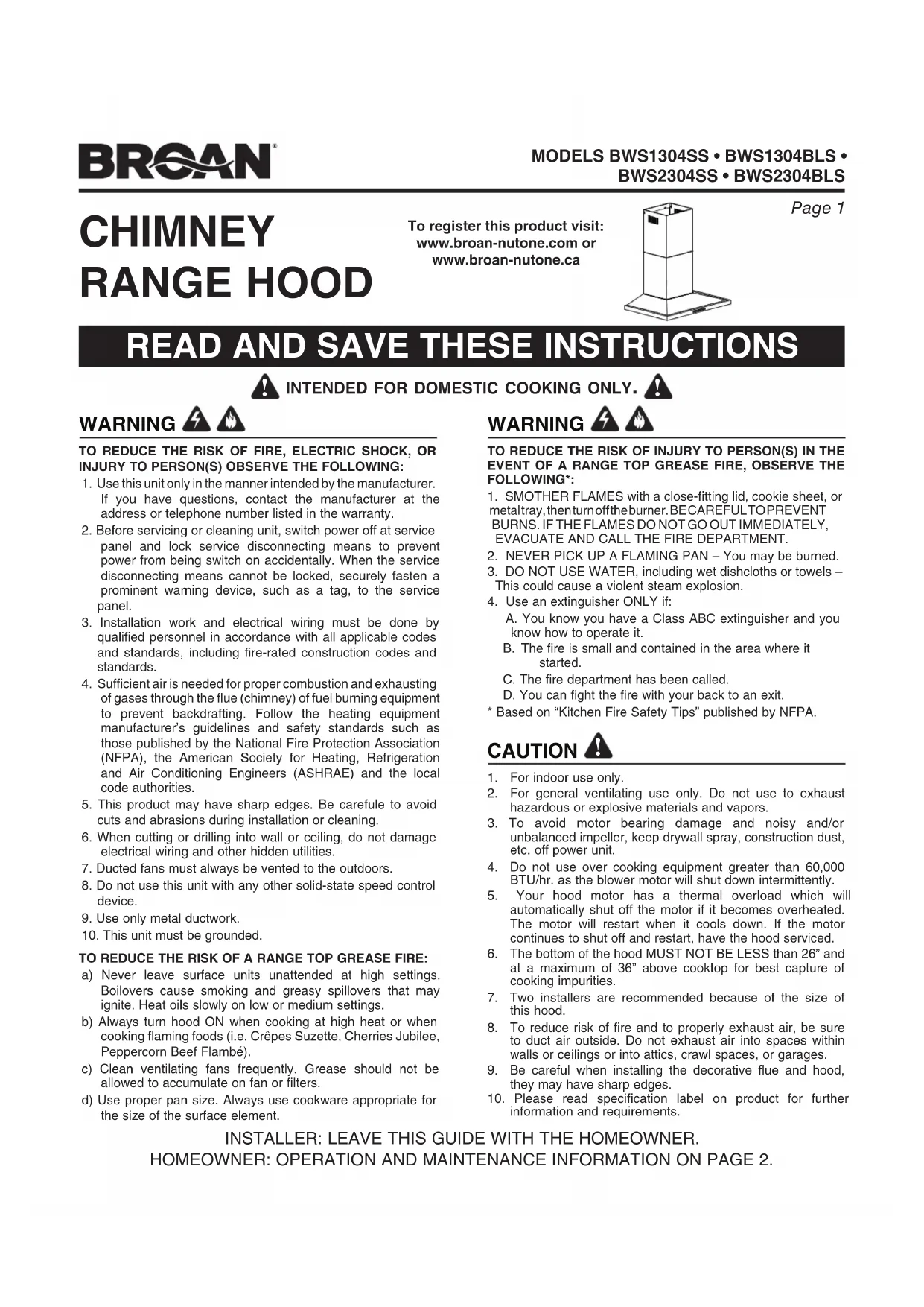 1. Pour usage intérieur seulement.2. Pour ventilation générale uniquement. N’utilisez pas cet appareil pour évacuer des matières ou des vapeurs dangereuses ou explosives.3. Pour ne pas endommager les roulements du moteur, déséquilibrer ou rendre bruyante la roue du moteur, protégez l’appareil de la poussière de plâtre, de construction, etc.4. N’utilisez pas cette hotte au-dessus d’un appareil de cuisson dépassant 60 000 BTU/heure car le moteur du ventilateur s’arrêtera par intermittence.5. Le moteur de la hotte est muni d’un dispositif de protection thermique qui coupe automatiquement le moteur en cas de surchauffe. Il se remet en marche lorsqu’il a refroidi. Faites réparer la hotte si le moteur continue à fonctionner par intermittence.6. Pour mieux capter les vapeurs de cuisson, le bas de la hotte DOIT ÊTRE AU MINIMUM à 26 po et au maximum à 36 po au-dessus de la surface de cuisson.7. Deux installateurs sont recommandés lors de l’installation, compte tenu de la taille de cette hotte.8. Pour réduire les risques d’incendie et évacuer l’air correctement, assurez-vous qu’il est évacué à l’extérieur. N’évacuez pas l’air dans des espaces enfermés par des murs ou un plafond ou dans un grenier, un vide sanitaire ou un garage.9. Prenez garde en installant la cheminée décorative et la hotte, car elles peuvent comporter des bords tranchants.10. Veuillez lire l’étiquette de spécifications du produit pour obtenir plus de renseignements, notamment sur les exigences.INSTALLATEUR : VEUILLEZ LAISSER CE GUIDE AU PROPRIÉTAIRE.PROPRIÉTAIRE : DIRECTIVES DE NETTOYAGE, D’ENTRETIEN ET D’UTILISATION À LA PAGE 13. AVERTISSEMENT Pour enregistrer ce produit, visitez : www.broan-nutone.com ouwww.broan-nutone.caPage 13
