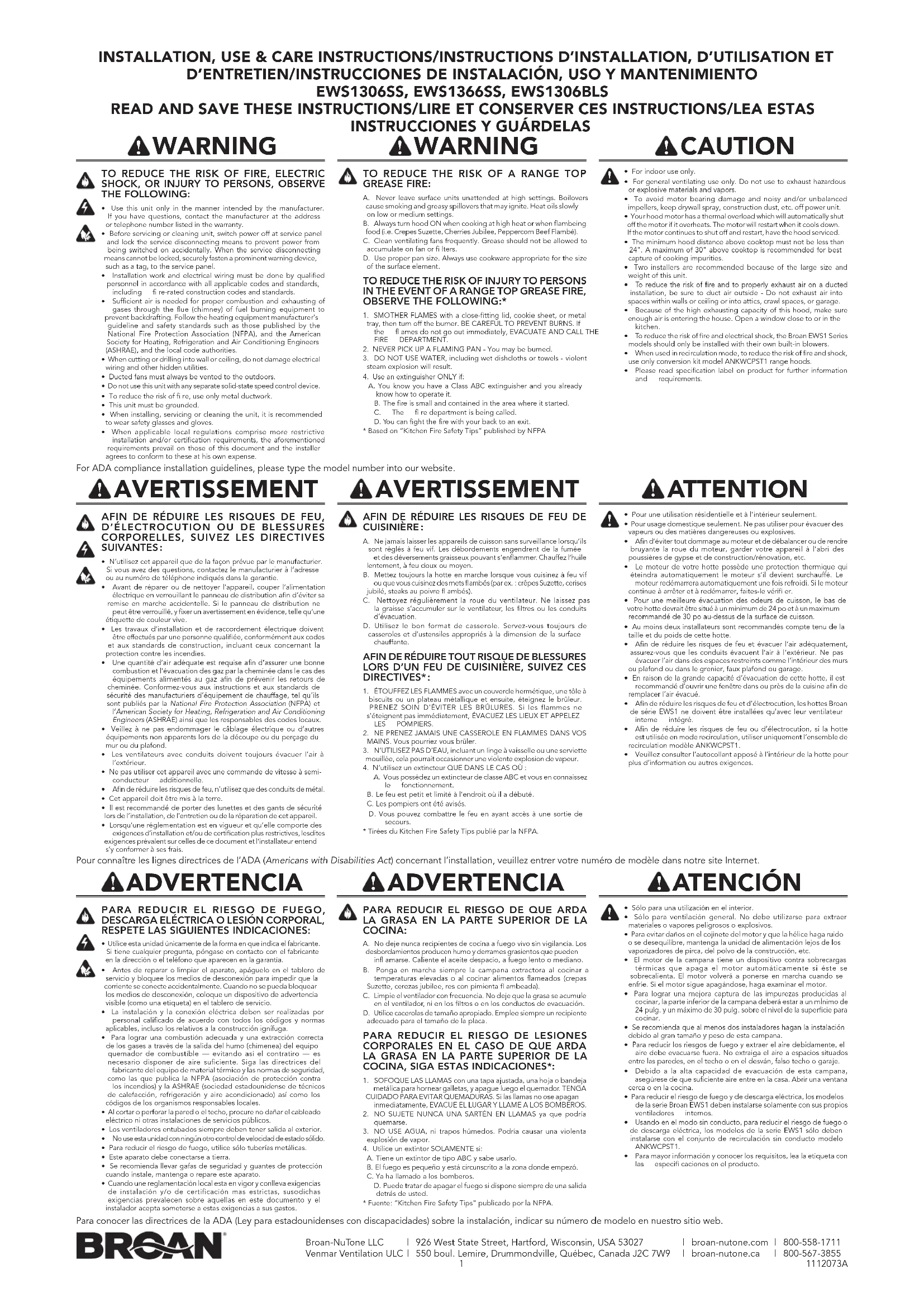 - Afi n de réduire les risques de feu et d’électrocution, les hottes Broan de série EWS1 ne doivent être installées qu’avec leur ventilateur interne intégré.