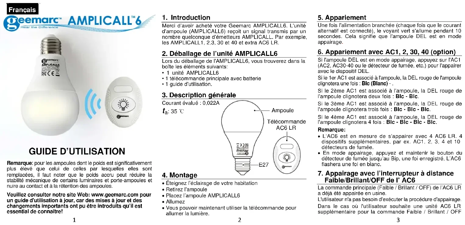 Merci d’avoir acheté votre Geemarc AMPLICALL6. L'unité d'ampoule (AMPLICALL6) reçoit un signal transmis par un nombre quelconque d'émetteurs AMPLICALL. Par exemple, les AMPLICALL1, 2,3, 30 et 40 et extra AC6 LR.