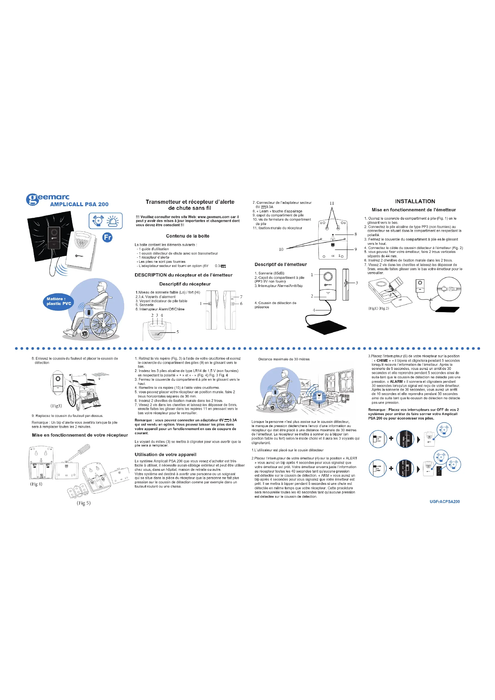 Matière : plastic PVC!!! Veuillez consulter notre site Web: www.geemarc.com car ilpeut y avoir des mises à jour importantes et changement dontvous devez être conscient !!!7. Connecteur de l’adaptateur secteur 6V 0.3A8. « Learn » touche d’appairage9. capot du compartiment de pile10. vis de fermeture du compartiment de pile11. xation murale du récepteur4. Coussin de détection deprésence1. Ouvrez le couvercle du compartiment à pile (Fig. 1) en le glissant vers le bas.2. Connectez la pile alcaline de type PP3 (non fournies) au connecteur se situant dans le compartiment en respectant la polarité.3. Fermez le couvercle du compartiment à pile en le glissant vers le haut.4. Connectez le câble du coussin détecteur à l’émetteur (Fig. 2)5. vous pouvez xer votre émetteur, faire 2 trous verticales séparés de 44 mm.6. Insérez 2 chevilles de xation murale dans les 2 trous.7. Vissez 2 vis dans les chevilles et laissez-les dépasser de 5mm, ensuite faites glisser vers le bas votre émetteur pour le verrouiller.8. Enlevez le coussin du fauteuil et placer le coussin de détection9. Replacez le coussin du fauteuil par-dessus.Remarque : Un bip d’alerte vous avertira lorsque la pile sera à remplacer toutes les 2 minutes. Mise en fonctionnement de votre récepteur Utilisation de votre appareil Remarque : vous pouvez connecter un adaptateur 6V 0.3A qui est vendu en option. Vous pouvez laisser les piles dans votre appareil pour un fonctionnement en cas de coupure de courant.Le voyant du milieu (3) se mettra à clignoter pour vous avertir que la pile sera à remplacer.1. Retirez la vis repère (Fig. 3) à l’aide de votre cruciforme et ouvrez le couvercle du compartiment des piles (9) en le glissant vers le bas. 2. Insérez les 3 piles alcaline de type LR14 de 1,5 V (non fournies) en respectant la polarité « + » et « - » (Fig. 4) Fig. 3 Fig. 43. Fermez le couvercle du compartiment à pile en le glissant vers le haut.4. Remettre la vis repère (10) à l’aide votre cruciforme.5. vous pouvez placer votre récepteur en position murale, faire 2 trous horizontales séparés de 36 mm.6. Insérez 2 chevilles de xation murale dans les 2 trous.7. Vissez 2 vis dans les chevilles et laissez-les dépasser de 5mm, ensuite faites les glisser dans les repères 11 en pressant vers le bas votre récepteur pour le verrouiller.1.L’utilisateur est placé sur le cousin détecteur2.Placez l’interrupteur de votre émetteur (4) sur la position « ALERT » vous aurez un bip après 4 secondes pour vous signalez que votre émetteur est prêt. Votre émetteur enverra juste l’information au récepteur toutes les 40 secondes tant qu’aucune pression est détectée sur le coussin de détection. « ARM » vous aurez un bip après 4 secondes pour vous signalez que votre émetteur est prêt. Il se mettra à bipper pendant 5 secondes si une chute est détectée en même temps que votre récepteur. Cette procédure sera renouvelée toutes les 40 secondes tant qu’aucune pression est détectée sur le coussin de détection.Le système Amplicall PSA 200 que vous venez d’acheter est très facile à utiliser, il nécessite aucun câblage extérieur et peut être utiliser chez vous, dans un hôpital, maison de retraite ou autre.Votre système est destiné à avertir une personne ou un soignant qui se situe dans la pièce du récepteur que la personne ne fait plus pression sur le coussin de détection comme par exemple dans un fauteuil roulant ou une chaise.Lorsque la personne n’est plus assise sur le coussin détecteur, le manque de pression déclenchera l’envoi d’une information au récepteur qui doit être placé à une distance maximale de 30 mètres de l’émetteur. Le récepteur se mettra à sonner ou à bipper (en position faible ou fort) selon le mode choisi et il aura les 3 voyants qui clignoteront.3.Placez l’interrupteur (6) de votre récepteur sur la position : « CHIME » » il bipera et clignotera pendant 5 secondes lorsqu’il recevra l’information de l’émetteur. Après la sonnerie de 5 secondes, vous aurez un arrêt de 30 secondes et elle reprendra pendant 5 secondes ainsi de suite tant que le coussin de détection ne détecte pas une pression. « ALARM » il sonnera et clignotera pendant 30 secondes lorsqu’un signal est reçu de votre émetteur. Après la sonnerie de 30 secondes, vous aurez un arrêt de 10 secondes et elle reprendra pendant 30 secondes ainsi de suite tant que le coussin de détection ne détecte pas une pression.Remarque : Placez vos interrupteurs sur OFF de vos 2 systèmes pour arrêter de faire sonner votre Amplicall PSA 200 ou pour économiser vos piles. FrConsulter notre site Internet pour obtenir la notice détaillée ou des informations et de l’aide sur nos produits: www.geemarc.com E-mail : sav@geemarc.fr Téléphone 03 28 58 75 99 Ouvert du lundi au vendredi de 9h à 16h Parc de l’Etoile, 2 Rue Galilée, 59760 Grande-Synthe,France. Produit fabriqué en Chine pour Geemarc Telecom Caractéristique de votre AMPLICALL PSA 200 Dépannage Portée : jusqu’à 30 métres Fréquence d’utilisation : 433.92Mhz Puissance de la fréquence radio : < 250mW Niveau de sonnerie : Emetteur : 75dB Récepteur : 85dB (fort) 70dB (faible) Energie : Emetteur : 1 pile alkaline 9V type PP3 Récepteur : 3 piles Alkaline 1.5V type LR14 Nombre de récepteur pour un émetteur :10