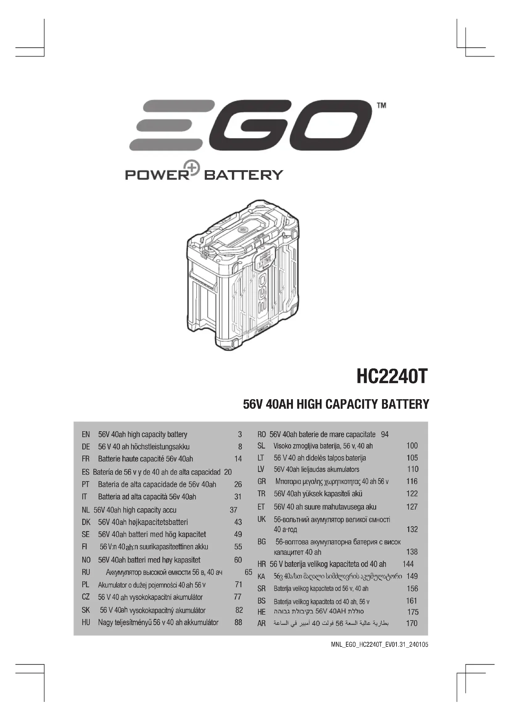Rendez-vous sur le site web egopowerplus.eu pour consulter l’intégralité des conditions de la politique de garantie EGO.BATERÍA DE 56 V Y DE 40 AH DE ALTA CAPACIDAD — HC2240T20