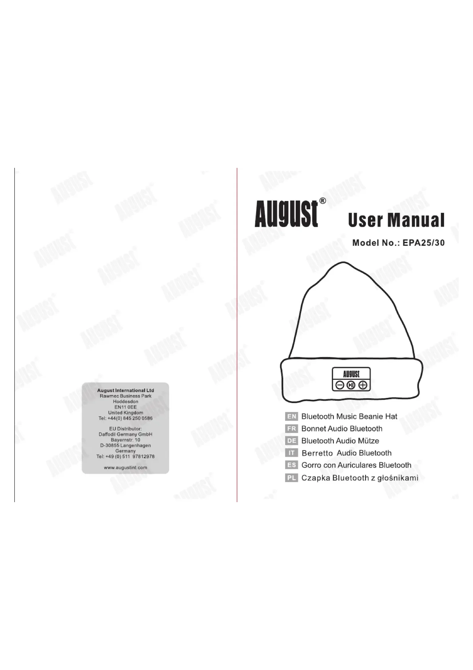 Nous vous remercions d'avoir acheté le Bonnet Audio Bluetooth August EPA25/30. Ce mode d'emploi vous permettra de vous familiariser avec les options de l'appareil. Nous vous prions de bien fouvoir dire attentivement ce dernier, même si vous étés déjà familier avec un produit similaire.
