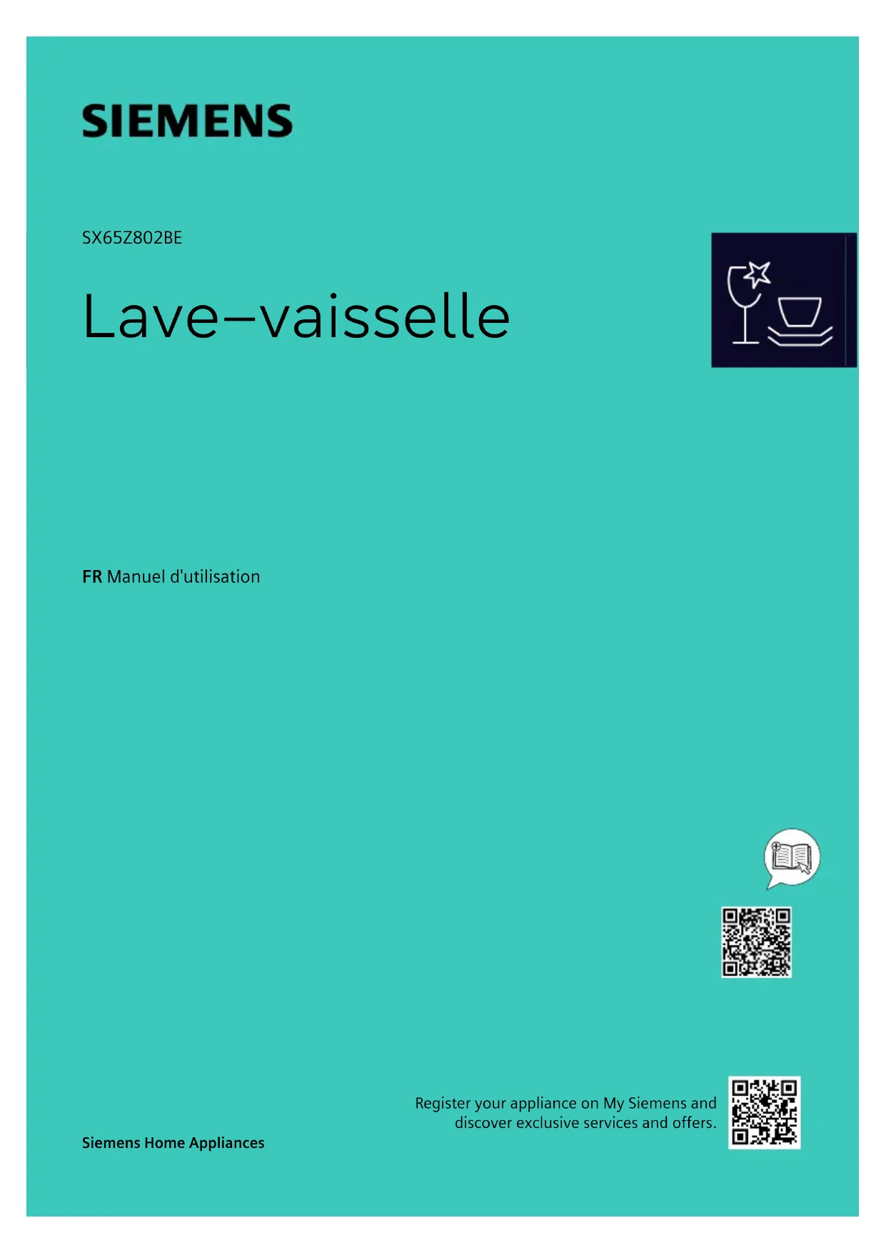SX65Z802BE Lave–vaisselle FR Manuel d'utilisation Siemens Home Appliances Register your appliance on My Siemens and discover exclusive services and offers.fr Table des matières Vous pouvez trouver d'autres informations et explications en ligne. Scannez le code QR sur la page de titre. Table des matièresTable des matières 1 Sécurité ........................................ 4
