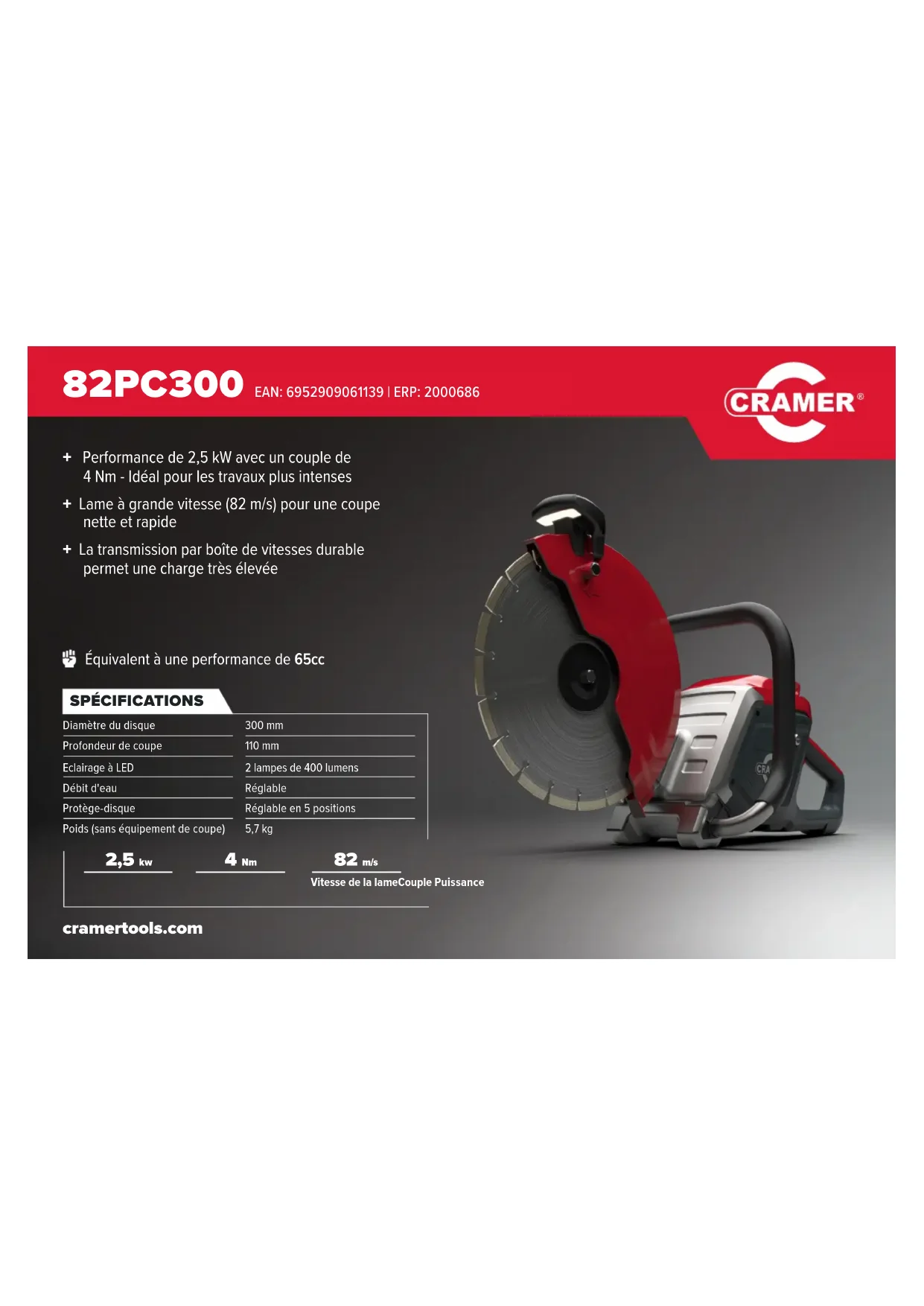cramertools.com Équivalent à une performance de 65cc + Performance de 2,5 kW avec un couple de 4 Nm-Idéal pour les travaux plus intenses+ Lame à grande vitesse (82 m/s) pour une coupe nette et rapide+ La transmission par boîte de vitesses durable permet une charge très élevée