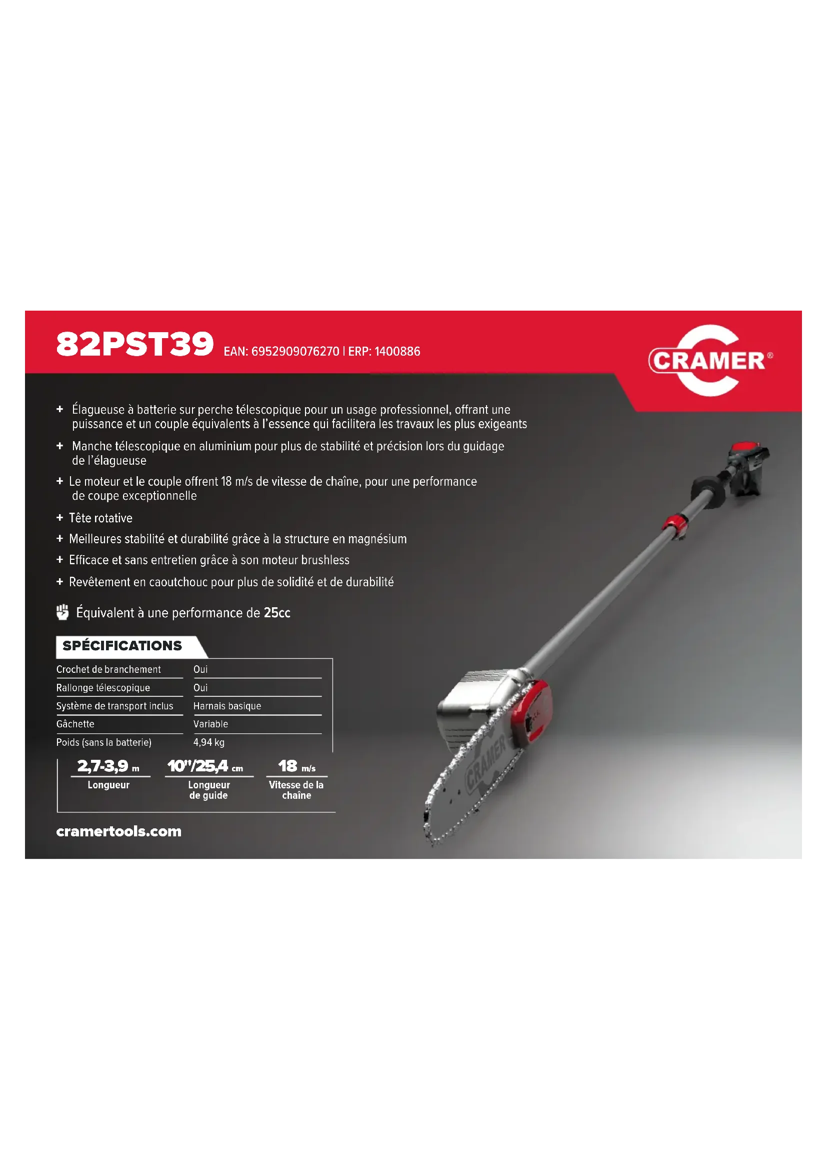 cramertools.com 10"/25,4 cm Longueur de guide Équivalent à une performance de 25cc + Élagueuse à batterie sur perche télescopique pour un usage professionnel, orant une puissance et un couple équivalents à l’essence qui facilitera les travaux les plus exigeants + Manche télescopique en aluminium pour plus de stabilité et précision lors du guidage de l’élagueuse+ Le moteur et le couple orent 18 m/s de vitesse de chaîne, pour une performance de coupe exceptionnelle+ Tête rotative+ Meilleures stabilité et durabilité grâce à la structure en magnésium+ Ecace et sans entretien grâce à son moteur brushless+ Revêtement en caoutchouc pour plus de solidité et de durabilité