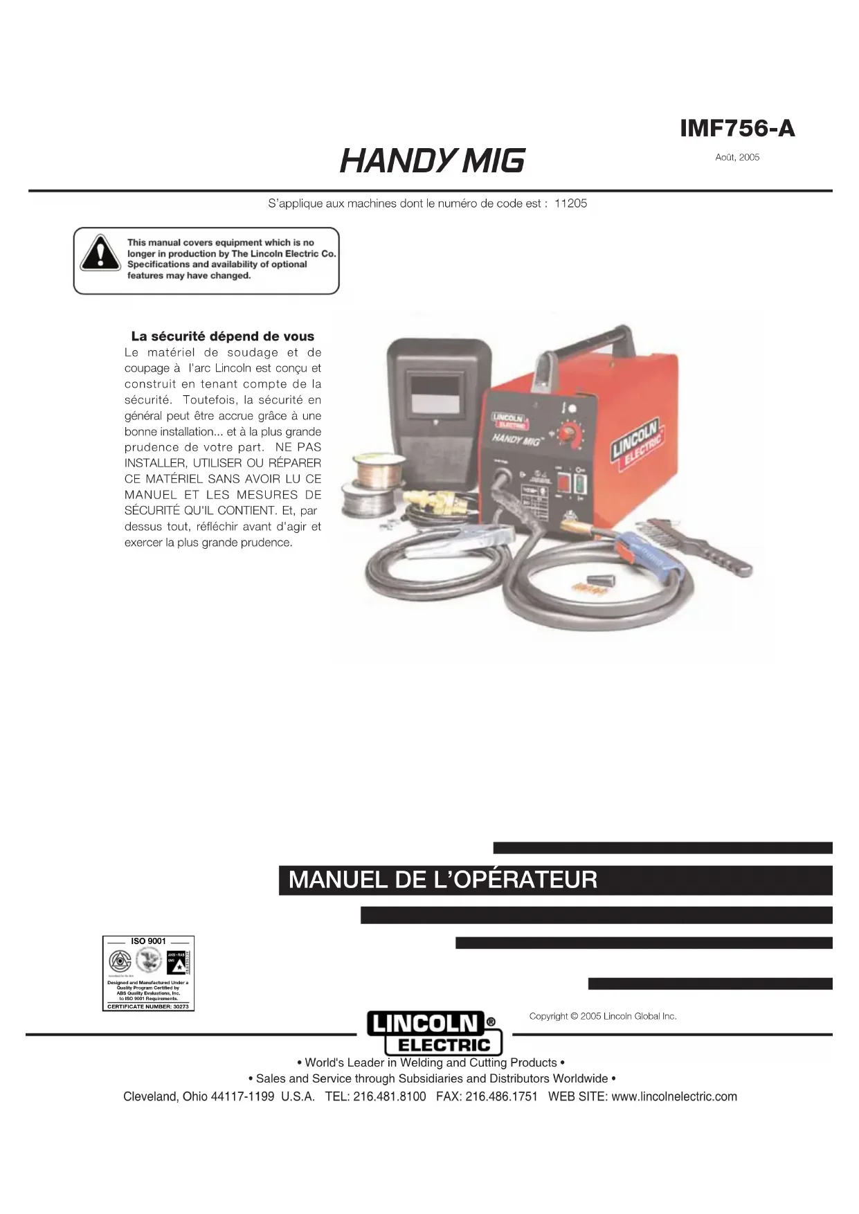 IMF756-A Août, 2005 La sécurité dépend de vous Le matériel de soudage et de coupage à l'arc Lincoln est conçu et construit en tenant compte de la sécurité. Toutefois, la sécurité en général peut être accrue grâce à une bonne installation... et à la plus grande prudence de votre part. NE PAS