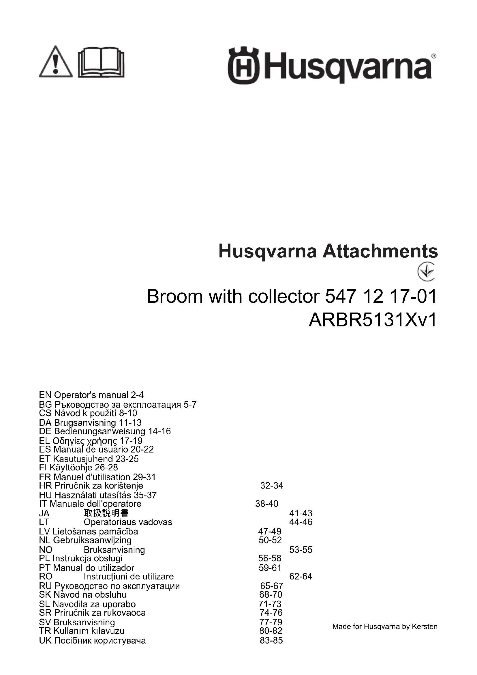 - Säilytä lisälaitetta puhtaassa ja kuivassa paikassa suojapeitteellä peitettynä. 28 2359 - 002 -Broom with collector: 547 12 17-01 Utilisation prévue Cet accessoire est utilisé avec une tondeuse autoportée Husqvarna pour balayer les surfaces horizontales. L'accessoire est utilisé sur les surfaces en asphalte ou de pavage. Toute autre utilisation est incorrecte. Le collecteur peut être remplacé par une protection anti- projections. La protection anti-projections est vendue séparément. Le fabricant n'est pas responsable des dommages causés par une utilisation incorrecte. Symboles figurant sur l'accessoire