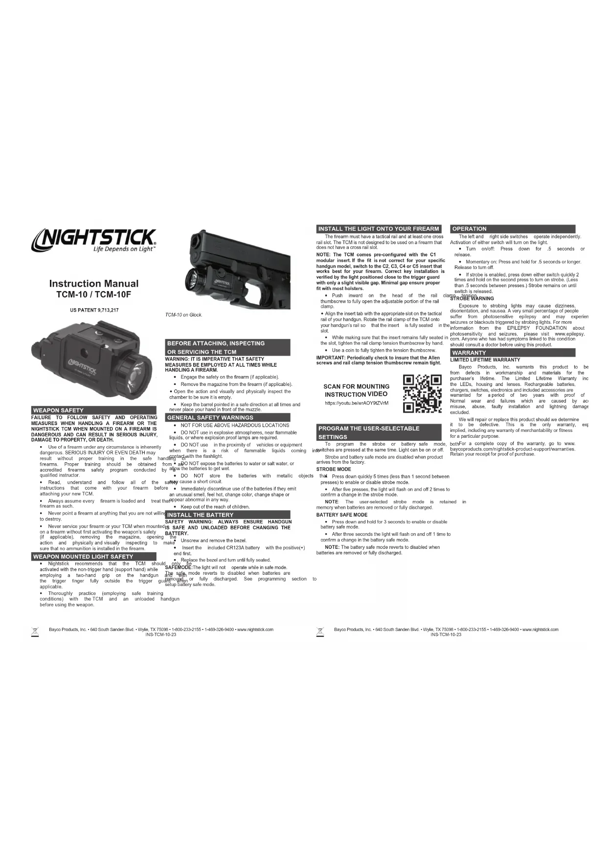 LA NON-CONFORMITÉ AUX INSTRUCTIONS DE SÉCURITÉ ET D’UTILISATION LORS DE LA MANIPULATION DES ARMES À FEU OU DU NIGHTSTICK TCM LORSQU’ILS SONT MONTÉS SUR DES ARMES À FEU EST DANGEREUSE ET PEUT ENTRAÎNER DES BLESSURES GRAVES, DES DOMMAGES MATÉRIELS OU LA MORT. y L’usage d’une arme à feu est, en toute circonstance,essentiellement dangereux. DES BLESSURES GRAVESOU MÊME LA MORT peuvent subvenir sans formationadéquatesurlamanipulationentoutesécuritédesarmesàfeu.Uneformationpertinentedevraitêtreobtenueàpartird’unprogrammereconnusurlasécuritédesarmesàfeudirigéeparuninstructeurqualié. y Lire, comprendre et suivre toutes les directives desécurité qui viennent avec votre arme à feu avantl’assemblagedevotrenouvellelampeTCM. y Toujoursprésumerquechaquearmeàfeusoitchargéeettraitercettearmeàfeucommetelle. y Nejamaisdirigerunearmeàfeusurunobjetdontvousnevoulezpasdétruire. y Ne jamais réparer votre arme à feu ou votre lampeTCMlorsqu’elleestmontéesurl’armesanspremièrementactiverla sûreté(s’ilyalieu), enleverle chargeur,ouvrirl’armeetvériervisuellementetmanuellementpourvousassurerqu’iln’yaucunemunitiondansl’armeàfeu.