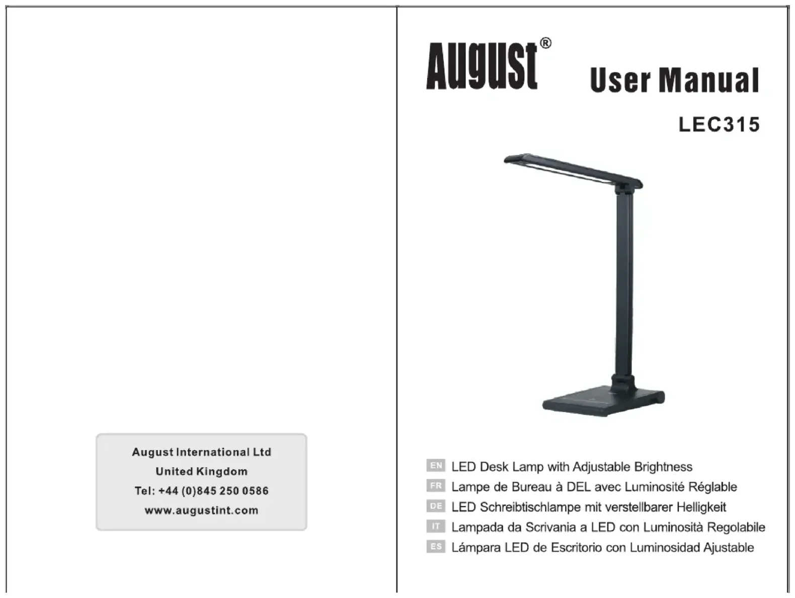 La lampe August LEC315 est couverte par une garantie de 2 ans contre les défauts de fabrication. Conservez votre preuve d'achat pour toute réclamation.
