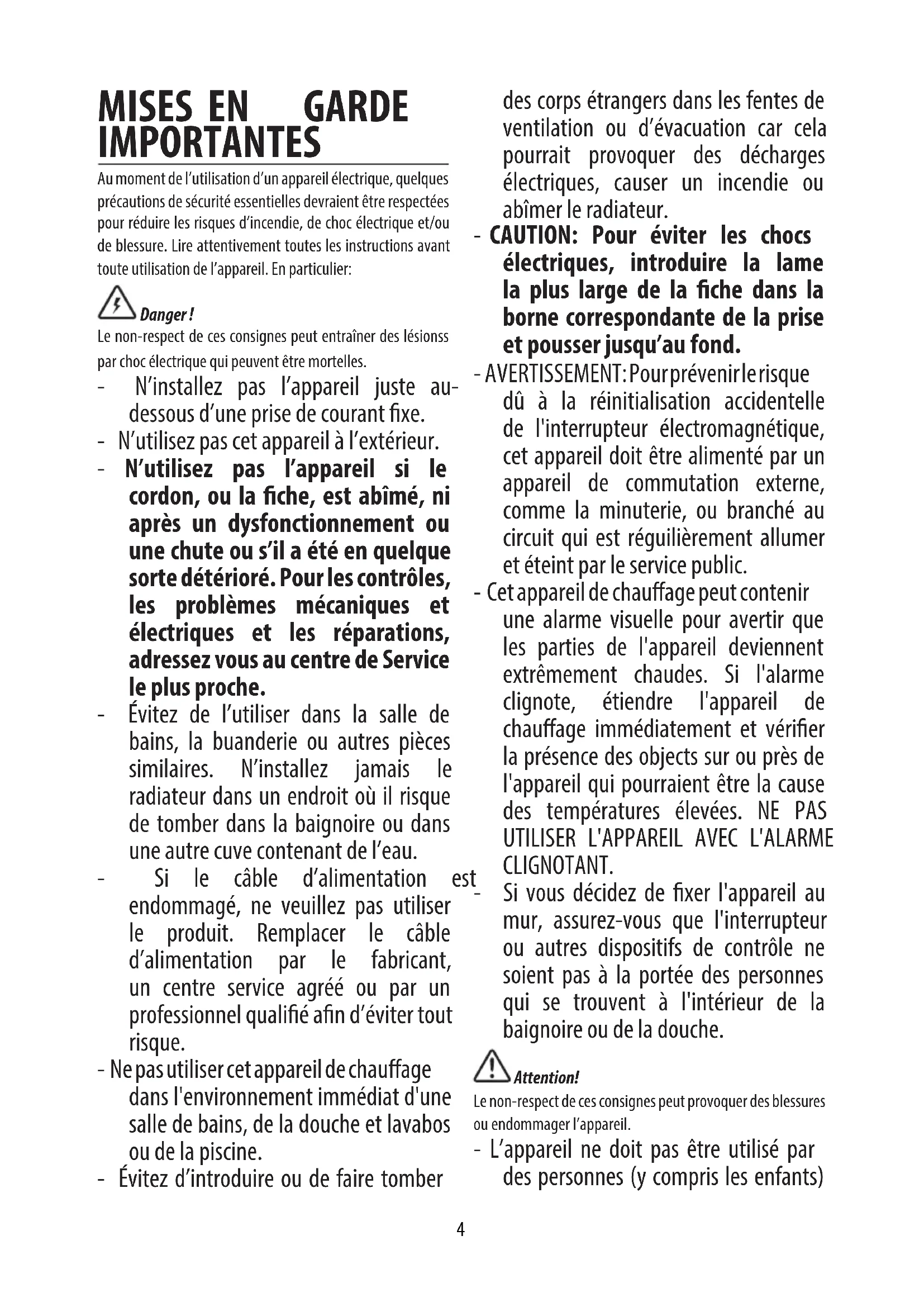 IMPORTANTES Au moment de l’utilisation d’un appareil électrique, quelques précautions de sécurité essentielles devraient être respectées pour réduire les risques d’incendie, de choc électrique et/ou de blessure. Lire attentivement toutes les instructions avant toute utilisation de l’appareil. En particulier: Danger ! Le non-respect de ces consignes peut entraîner des lésionss par choc électrique qui peuvent être mortelles. - N’installez pas l’appareil juste au- dessous d’une prise de courant xe. - N’utilisez pas cet appareil à l’extérieur. - N’utilisez pas l’appareil si le cordon, ou la che, est abîmé, ni après un dysfonctionnement ou une chute ou s’il a été en quelque sorte détérioré. Pour les contrôles, les problèmes mécaniques et électriques et les réparations, adressez vous au centre de Service le plus proche. - Évitez de l’utiliser dans la salle de bains, la buanderie ou autres pièces similaires. N’installez jamais le radiateur dans un endroit où il risque de tomber dans la baignoire ou dans une autre cuve contenant de l’eau. - Si le câble d’alimentation est endommagé, ne veuillez pas utiliser le produit. Remplacer le câble d’alimentation par le fabricant, un centre service agréé ou par un professionnel qualié an d’éviter tout risque. - Ne pas utiliser cet appareil de chauage dans l'environnement immédiat d'une salle de bains, de la douche et lavabos ou de la piscine. - Évitez d’introduire ou de faire tomber des corps étrangers dans les fentes de ventilation ou d’évacuation car cela pourrait provoquer des décharges électriques, causer un incendie ou abîmer le radiateur. - CAUTION: Pour éviter les chocs électriques, introduire la lame la plus large de la che dans la borne correspondante de la prise et pousser jusqu’au fond. - AVERTISSEMENT: Pour prévenir le risque dû à la réinitialisation accidentelle de l'interrupteur électromagnétique, cet appareil doit être alimenté par un appareil de commutation externe, comme la minuterie, ou branché au circuit qui est réguilièrement allumer et éteint par le service public. - Cet appareil de chauage peut contenir une alarme visuelle pour avertir que les parties de l'appareil deviennent extrêmement chaudes. Si l'alarme clignote, étiendre l'appareil de chauage immédiatement et vérier la présence des objects sur ou près de l'appareil qui pourraient être la cause des températures élevées. NE PAS