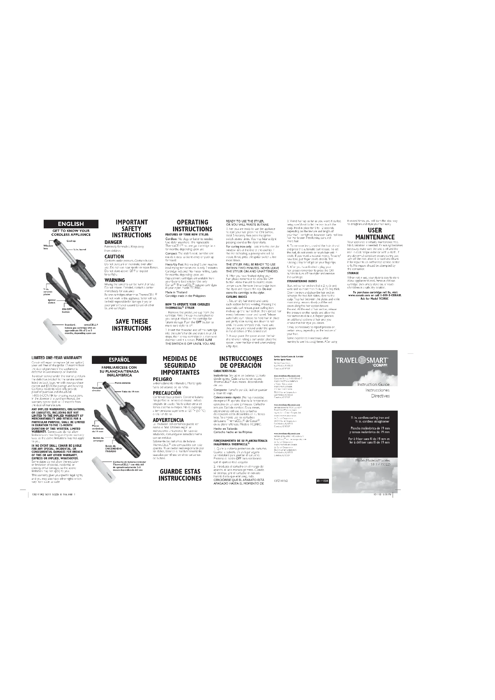 Conair dans votre fer. Modèle TC2RBC.Fabriqué en ThaïlandeCartouche fabriquées aux PhilippinesMODE D'EMPLOI DU FER À FRISER/DÉFRISER SANS FIL THERMACELL 1. Retirer le couvercle de protection de lacartouche. Garder le couvercle dans unendroit sûr. Vous en aurez besoin pourranger la cartouche. Appuyer sur le boutonOFF pour s'assurer que l'appareil est éteint.2. Introduire la cartouche, le côté filetéd'abord, dans le manche du fer. Lorsqu'elles'arrête, visser la cartouche dans le sens desaiguilles d'une montre jusqu'à ce qu'ellearrête de tourner. VÉRIFIER QUEL'APPAREIL EST ÉTEINT (OFF) OU VOUSGASPILLEREZ DU BUTANE.3. Pour allumer l'appareil, appuyer sur lebouton ON. Attendre 5 secondes, puisappuyer plusieurs fois sur le boutond'allumage Il se peut que vous entendiezun bruit sec quand le fer se met en marche. Instructions pour les fers à friser uniquement : Regarder au travers de la fenêtre circulaire au bout de l'embout isolant. Un fil lumineux sera visible lorsque l'appareil chauffe. Si ce n'est pas le cas, appuyer une fois encore sur le bouton d'allumage, plusieurs fois de suite.LE FER SERA PRÊT À L'UTILISATION EN DEUX MINUTES. NE JAMAIS LAISSER L'APPAREIL SANS SURVEILLANCE APRÈS L'AVOIR ALLUMÉ.4. Une fois terminé, appuyer sur le boutonOFF pour éteindre le fer. Laisser l'appareilrefroidir avant de le ranger. Retirer lacartouche de l'appareil et remettre lecouvercle de protection en place. Ne pasgarder la cartouche à l'intérieur du fer.LES RUDIMENTS DU FRISAGE 1. Séparer les cheveux secs en sectionsuniformes et peigner chaque section. Appuyer sur la manette pour ouvrir lalanguette. Placer le fer à mi-chemin sur lamèche, en étalant les cheveux uniformémententre la languette et le tube. Relâcher lamanette pour bloquer les cheveux et faireglisser le fer doucement vers les pointes. Pour éviter que les pointes ne soientgaufrées, les enrouler sous la languette dansla direction voulue.2. Pour boucler les cheveux vers l'intérieur, positionner le fer de façon à ce que lalanguette se trouve sur le dessus. Pourboucler les cheveux vers l'extérieur, positionner le fer de façon à ce que lalanguette se trouve en-dessous.3. Enrouler les cheveux aussi haut que voulu, en prenant soin d’éviter de toucher le cuirchevelu. Tenir en place pendant 8–12secondes, selon la longueur des cheveuxet la texture désirée. Pour obtenir desboucles plus serrées, prendre une mècheplus fine. Pour obtenir des boucles pluslâches, prendre une mèche plus épaisse.4. Pour retirer le fer, dérouler doucementles cheveux et appuyer sur la manette. Attendre que les cheveux aient refroidi vant de les brosser ou de les peigner. vous souhaitez des ondulations naturellesavec un air d'été, frotter un peu de gel entrele bout des doigts et passer les doigts dansles cheveux.5. Une fois terminé, appuyer sur lebouton OFF pour éteindre le fer et retirerla cartouche.RUDIMENTS DU DÉFRISAGESéparer les cheveux en section de 5 cm de large sur 1.5 cm de large tout au plus. Ouvrir le fer et placer une section de cheveux entre les plaques, près du cuir chevelu. Refermer les plaques et faire glisser le fer doucement vers les pointes, sans relâcher la tension. Une fois arrivé aux pointes, ouvrir les plaques et relâcher les cheveux. Répéter section par section jusqu'à l'obtention du style désiré. Selon la texture des cheveux, il se peut qu'il faille défriser certaines sections plusieurs fois.Quelques essais seront de mise au cours des premières utilisations. L’expérience vous aidera à déterminer la technique idéale pour obtenir les résultats voulus. DIRECTIVES D'ENTRETIEN Votre appareil demande peu d’entretien. Il n’est pas nécessaire de le lubrifier. Pour le nettoyer, l'éteindre, le laisser refroidir et essuyer le boîtier avec un linge propre. En cas de problème, éteindre le fer, le laisser refroidir et le renvoyer à un service après-vente autorisé. N’essayez pas de le réparer.RANGEMENTLorsque vous ne l’utilisez pas, votre appareil est facile à ranger. Laissez le refroidir, retirer la cartouche (remettre le couvercle de protection sur cette-dernière) et gardez l'appareil dans un endroit sûr et sec, hors de portée des enfants.Pour acheter des cartouches de rechange, visiter www.conair.com ou appeler le 1-800-3-CONAIR. Demander le modèle TC2RBC