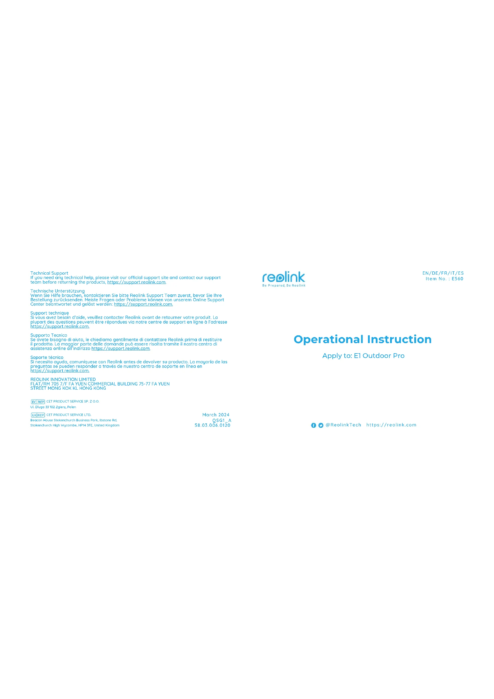 Retrouvez gratuitement la notice de l'appareil E1 Outdoor Pro REOLINK au format PDF.