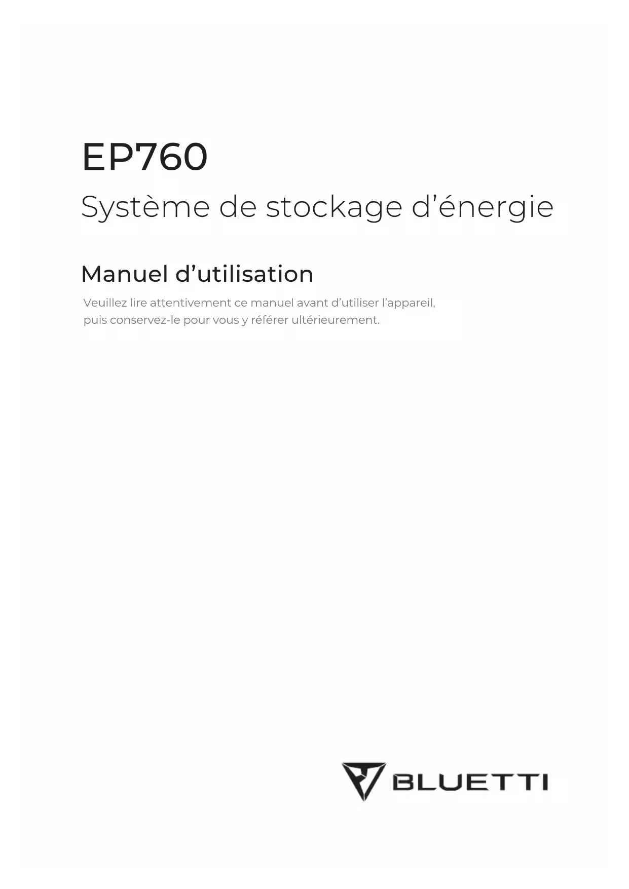 EP760 Système de stockage d’énergie Manuel d’utilisation Veuillez lire attentivement ce manuel avant d’utiliser l’appareil, puis conservez-le pour vous y référer ultérieurement.Merci! Merci d’avoir choisi BLUETTI. Dès les premières heures, BLUETTI s’est efforcé de promouvoir la durabilité pour un avenir meilleur, en proposant des solutions de stockage d’énergie vertes. Pour une utilisation intérieure et extérieure, les produits BLUETTI vous proposent une expérience écologique exceptionnelle, pour le respect de nos maisons et de notre monde. C’est pourquoi BLUETTI est présent dans plus de 70pays et a obtenu la confiance de millions de clients à travers le monde.Présentation Copyright © 2023 ShenzhenPowerOakNewenerCo., Ltd. Tous droits réservés. Aucune partie de ce document ne peut être reproduite ou transmise sous quelque forme ou par quelque moyen que ce soit sans l’accord écrit préalable de ShenzhenPowerOakNewenerCo., Ltd. Remarque Les produits, services et fonctionnalités de BLUETTI que vous achetez sont soumis aux conditions générales. Il est possible que l’ensemble ou une partie des produits, services et fonctionnalités mentionnés dans ce manuel ne soit pas compris dans le cadre de votre achat. Sauf accord contraire dans le présent contrat, BLUETTI n’assure aucune représentation ni garantie explicite ou implicite quant au contenu de ce manuel. Le contenu de ce manuel peut être modifié sans préavis. La dernière version est à consulter sur le site officiel de BLUETTI. Pour toutes questions concernant ce manuel, veuillez contacter le service client BLUETTI. ShenzhenPowerOakNewenerCo., Ltd. 19F, Block A, Kaidaer Building,No. 168 Tongsha Road, Nanshan District, Shenzhen, Guangdong, ChinaPrésentation du manuel Utilisation Ce manuel d’utilisation présente les explications concernant l’installation, le raccordement électrique, la mise en service, l’entretien et le dépannage du système de stockage d’énergieEP760. Toutes les instructions de ce manuel doivent être comprises avant d’utiliser l’appareil. Public visé