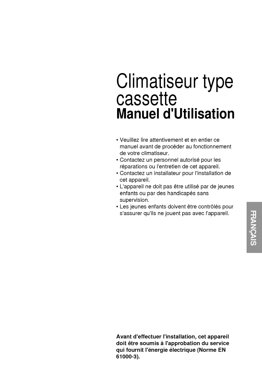 Climatiseur type cassette Manuel d'Utilisation + Veuillez lire attentivement et en entier ce manuel avant de procéder au fonctionnement de votre climatiseur. + Contactez un personnel autorisé pour les réparations ou l'entretien de cet appareil. + Contactez un installateur pour l'installation de cet appareil. + L'appareil ne doit pas être utilisé par de jeunes enfants ou par des handicapés sans supervision. + Les jeunes enfants doivent être contrôlés pour s'assurer qu'ils ne jouent pas avec l'appareil. Avant d'effectuer l'installation, cet appareil doit être soumis à l'approbation du service qui fournit l'énergie électrique (Norme EN 61000-3). SIVÔNVEH