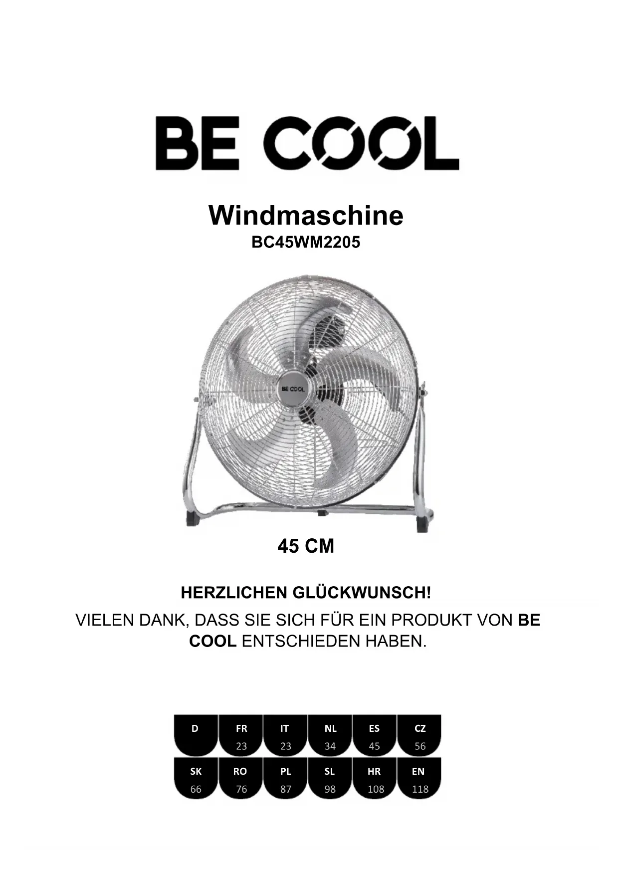 8,2 m/s Norme de mesure pour la détermination du rapport de service IEC 60879:2019 Adresse de contact pour de plus amples informations et ligne de service : Schuss Home Electronic GmbH Scheringgasse 3, A-1140 Vienne Tel : +43 (1) 97 0 21 - 0 www.becool.at Numéro de registre du commerce : 236974 t / Tribunal du registre du commerce : Vienne22 GARANTIE En achetant un produit de qualité BE COOL, vous faites l'acquisition d'un article innovant, durable et fiable. Pour cet appareil BE COOL, nous accordons une garantie de 2 ans à compter de la date d'achat, valable en Autriche uniquement. Dans le cas improbable où une intervention sur votre appareil serait nécessaire pendant cette période, nous garantissons une réparation gratuite (pièces détachées et main-d'œuvre) ou (sous réserve de la décision de Schuss) le remplacement du produit. Si ni la réparation ni l'échange n'ont de sens d'un point de vue économique, nous nous réservons le droit d'accorder un crédit sur la base de la valeur actuelle. En ce qui concerne les appareils de climatisation, vous devez toujours contacter en premier lieu le service d'assistance téléphonique (voir l'étiquette sur l'appareil ou la page de titre du manuel d'instructions), en cas de ventilateurs, contactez votre revendeur ou nous directement. Veuillez noter que les réparations qui ne sont pas effectuées par l'atelier agréé en Autriche annulent immédiatement la garantie. Cette garantie n'inclut pas