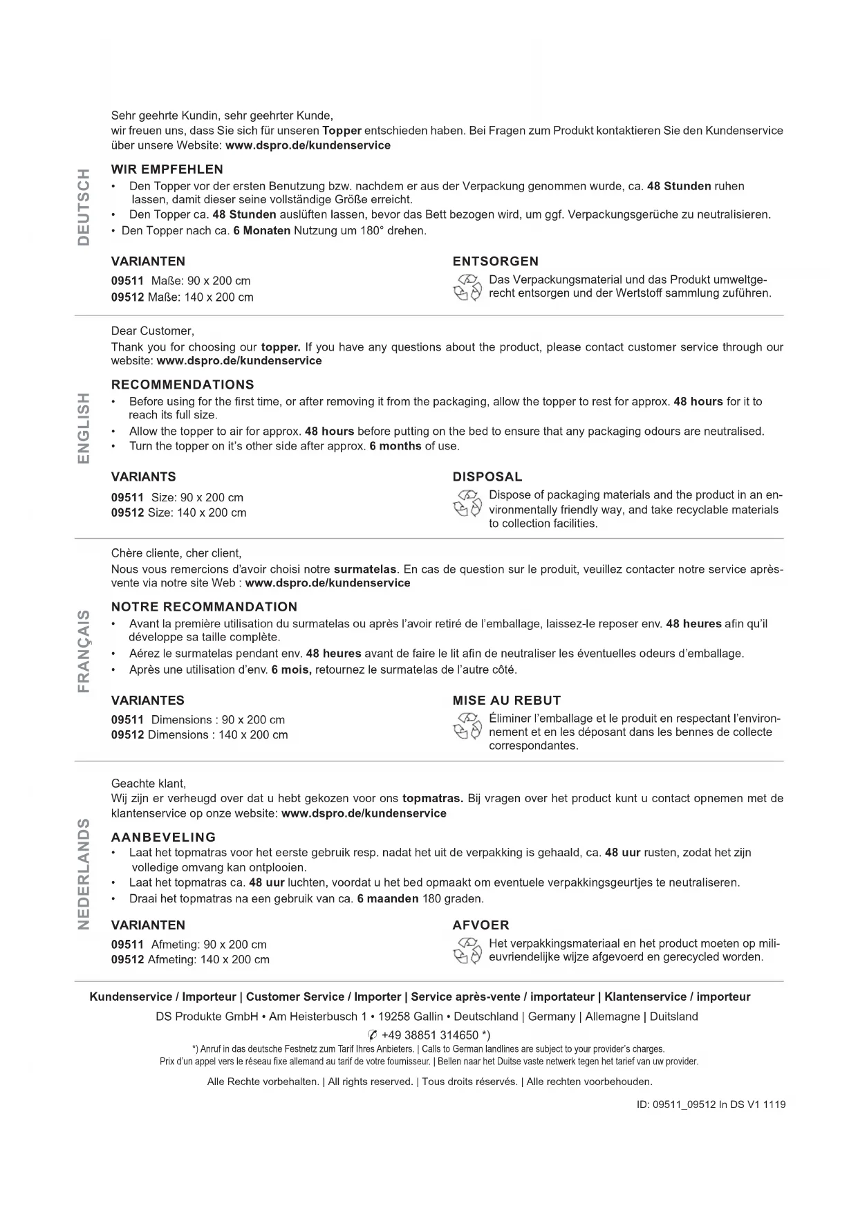 - Après une utilisation d’env. 6 mois, retournez le surmatelas de l’autre côté. VARIANTES 09511 Dimensions : 90 x 200 cm 09512 Dimensions : 140 x 200 cm