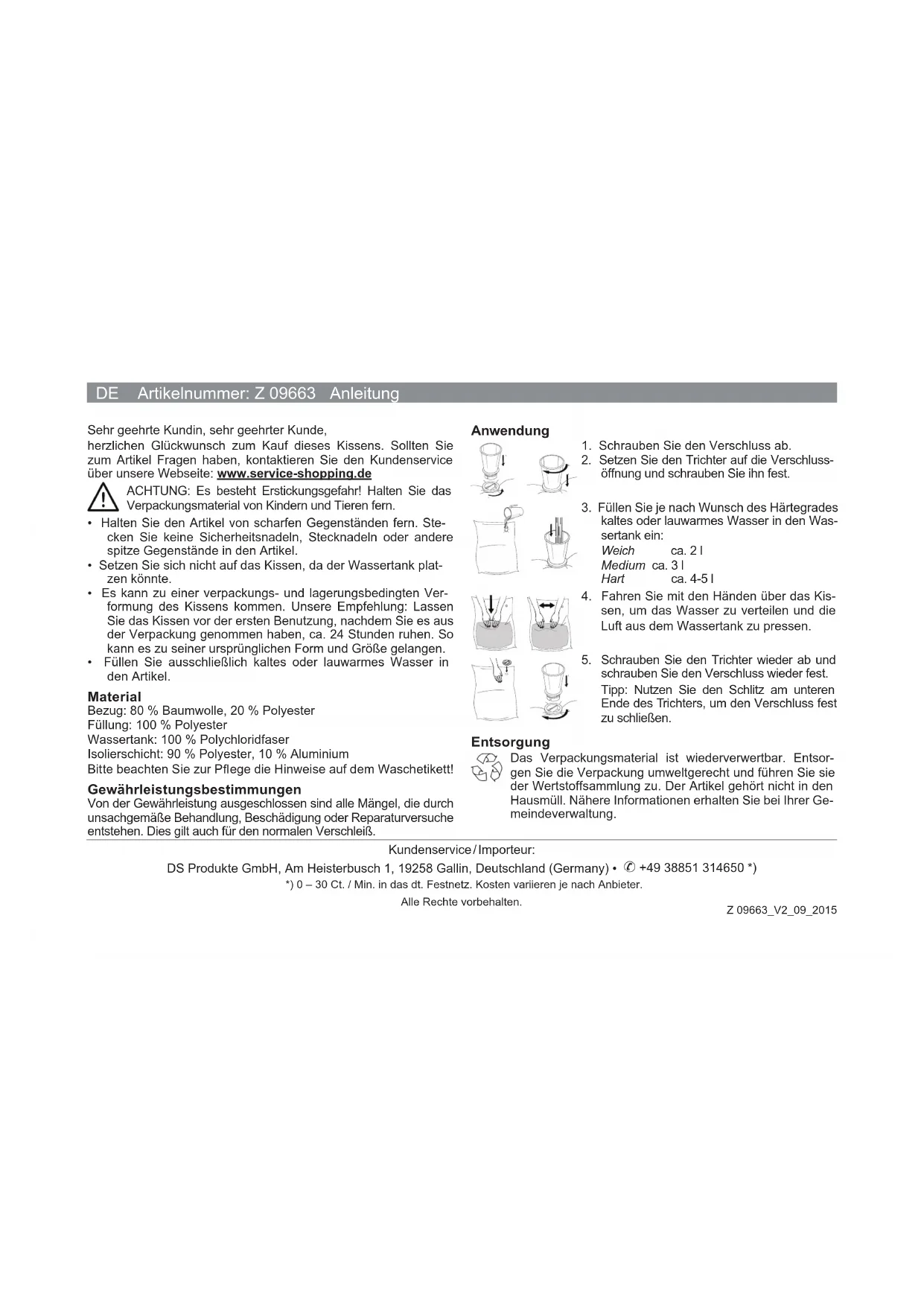 Z 09663_V2_09_2015FR Réf. art. : Z 09663 Mode d'emploi Service après-vente / importateur : DS Produkte GmbH, Am Heisterbusch 1, 19258 Gallin, Allemagne • ✆ +49 38851 314650 *) *) Appel payant. Coût variable selon le prestataire. Tous droits réservés. Chère cliente, cher client, Nous vous félicitons d'avoir acheté ce coussin. Pour toute question concernant cet article, vous pouvez contacter le service après- vente à partir de notre site Internet : www.service-shopping.de ATTENTION : risque de suffocation ! Tenez les emballages hors de portée des enfants et des animaux.