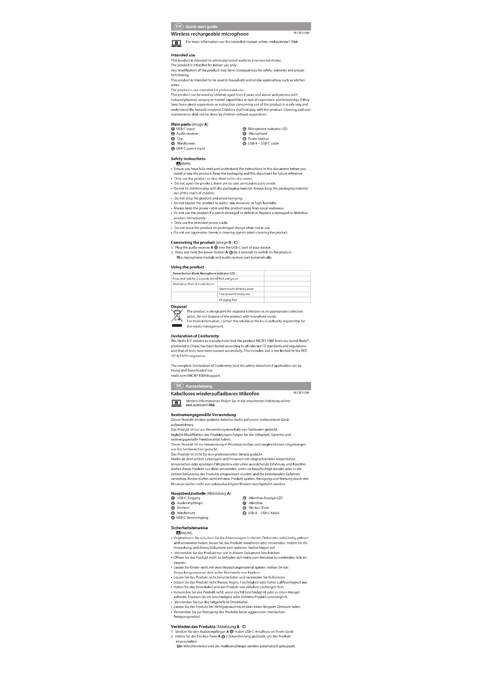 dans le port USB-C de votre appareil.2. Appuyez et maintenez le bouton d’alimentation A pendant 2secondes pour mettre le produit en marche. Le module microphone et le récepteur audio s’appairent automatiquement. Utiliser le produit Bouton d’alimentation Mode Voyant LED du microphoneAppuyez et maintenez pendant 2 secondesBouton marche/arrêt Rouge et vert Appui court Mode normal Verte Mode silencieux Vert clignotantLow power Clignotement rougeEn cours de charge Rouge Traitement des déchets Le produit doit être jeté séparément des ordures ménagères dans un point de collecte approprié. Ne jetez pas le produit avec les ordures ménagères ordinaires.Pour plus d’informations, contactez le distributeur ou l’autorité locale responsable de la gestion des déchets. Déclaration de conformité Nous, Nedis B.V., déclarons en tant que fabricant que le produit MICW110BK de notre marque Nedis®, produit en Chine, a été testé conformément à toutes les normes et réglementations CE en vigueur et que tous les tests ont été réussis. Cela inclut, sans toutefois s'y limiter, la directive RED 2014/53/UE.La Déclaration de conformité complète (et la che de sécurité le cas échéant) peut être trouvée et téléchargée via:nedis.fr/MICW110BK#support