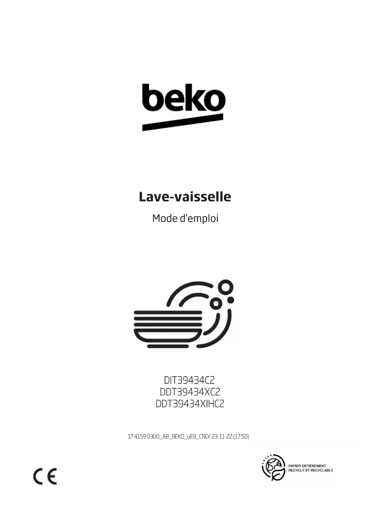 Lave-vaisselle Mode d’emploi 17 4159 0300_AB_BEKO_uE8_CND/ 23-11-22.(17:50) DIT39434C2 DDT39434XC2 DDT39434XIHC2Cher client, Veuillez lire le présent manuel d’utilisation avant d’utiliser le produit. Merci d’avoir choisi ce produit Beko. Nous espérons que vous obtiendrez les meilleurs résultats avec notre produit fabriqué à partir d’une technologie de pointe et de matériaux de qualité supérieure. C’est pourquoi nous vous recommandons, avant d’utiliser ce produit, de lire attentivement ce manuel et tous les autres documents fournis. Veillez à bien respecter les consignes et les instructions figurant dans le manuel d’utilisation. Ainsi, vous pouvez vous protéger et protéger votre produit contre les dangers potentiels. Veuillez conserver ce manuel d’utilisateur. Si vous confiez le produit à quelqu’un d’autre, n’oubliez pas de lui remettre également le manuel d’utilisation. Numéro de série Modèle Achat d’origine Date d’achat Ville Marchande Code postal État Les paysTABLE DES MATIÉRES