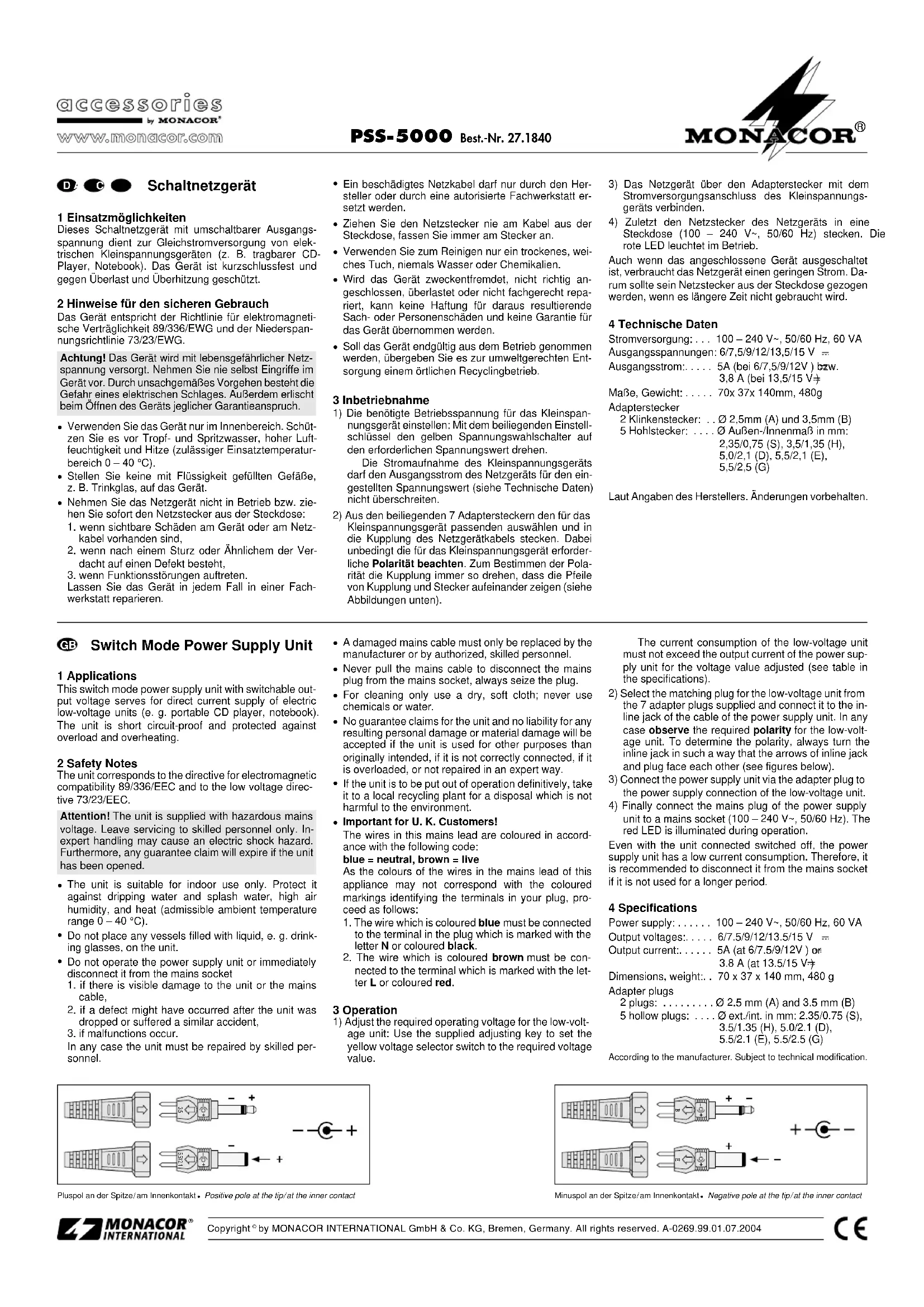 PSS-5000 - Chargeur de piles Monacor - Notice d'utilisation et mode d'emploi gratuit