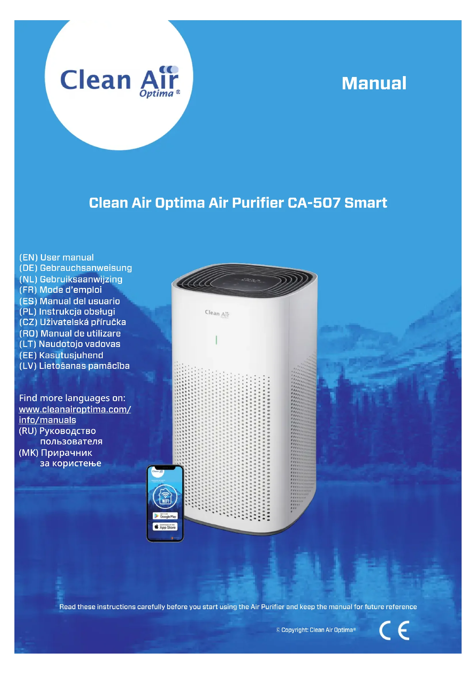 ainsi que les circonstances à l'origine de ces problèmes. Le purificateur d’air Clean Air Optima CA-507 Smart est soumis à des procédures d'essai strictes avant de quitter l'usine. Si, dans un délai de 2ans à compter dela date d'achat, le produit ne fonctionne pas conformément aux spécifications en raison de défauts d'usine, l'acheteur a droit à la réparation ou au remplacement gratuit des pièces défectueuses sur simple présentation de cette garantie (à condition que le dysfonctionnement ou les dommages à l'appareil et/ou à ses éléments soient survenus dans des conditions normales de fonctionnement). Ce qui est couvert par la garantie: Toutes les pièces défectueuses, en raison d'un défaut de matériel ou de fabrication. Durée: deux ans à compter de la date d'achat. Ce que nous ferons: Réparer ou remplacer toute pièce défectueuse. Exclusions: Remplacement régulier des filtres. Autres conditions Les dispositions de la présente garantie remplacent toute autre garantie écrite, expresse ou implicite, écrite ou orale, y compris toute garantie de qualité marchande ou d'adaptation à un usage particulier. La responsabilité maximale du fabricant ne peut pas excéder le prix d'achat réel que vous avez payé pour le produit. En aucun cas, le fabricant ne pourra être tenu responsable de dommages spéciaux, accidentels, conséquents ou indirects. Cette garantie ne couvre pas les défaillances résultant d'une utilisation ou d'un entretien inapproprié oudéraisonnable, d'un montage incorrect, d'un accident ou de catastrophes naturelles, d'unemballage inadéquat, ou d'une falsification, altération ou modification non autorisée, telsque déterminés à notre seule discrétion. La présente garantie est nulle si l'étiquette portant lenuméro de série a été retirée ou eacée.53 Merci de votre lecture! Faites-nous part de vos commentaires sur le purificateur d’air Clean Air Optima CA-507 Smart sur: www.cleanairoptima.com. Pour les questions fréquemment posées au sujet du CA-507 Smart, accédez à: www.cleanairoptima.com et recherchez le CA-507 Smart. Téléchargez le mode d'emploi au format PDF sur: www.cleanairoptima.com/info/manuals. Regardez toutes les vidéos d'animation des produits Clean Air Optima sur: www.youtube.com. Clean Air Optima International B.V. | David Ricardostraat 9-7 / 9-9 | 7559 SH Hengelo (ov) Pays-Bas | Téléphone: +31 (0) 74 - 2670145 Clean Air Optima Germany GmbH | Enschedestraße 14 | 48529 Nordhorn | Allemagne Téléphone: +49 (0) 5921 879-121 E-mail: info@cleanairoptima.com Site Web: www.cleanairoptima.com54 Español Le agradecemos la compra del purificador de aire Clean Air Optima CA-507 Smart. Este eficiente y eficaz producto le proporcionará muchos años de aire interior saludable. Cuando utilice este aparato eléctrico, cumpla siempre todas las medidas de seguridad para su correcto funcionamiento. En estas instrucciones se explican las medidas de seguridad que debe respetar durante su funcionamiento, las cuales han sido concebidas para evitar daños personales y en el propio aparato. Antes de utilizar su nuevo purificador de aire Clean Air Optima CA-507 Smart. Retire primero los sellos de los filtros (consulte la página 56). Modo de empleo CA-507 Smart / Descripción del aparato