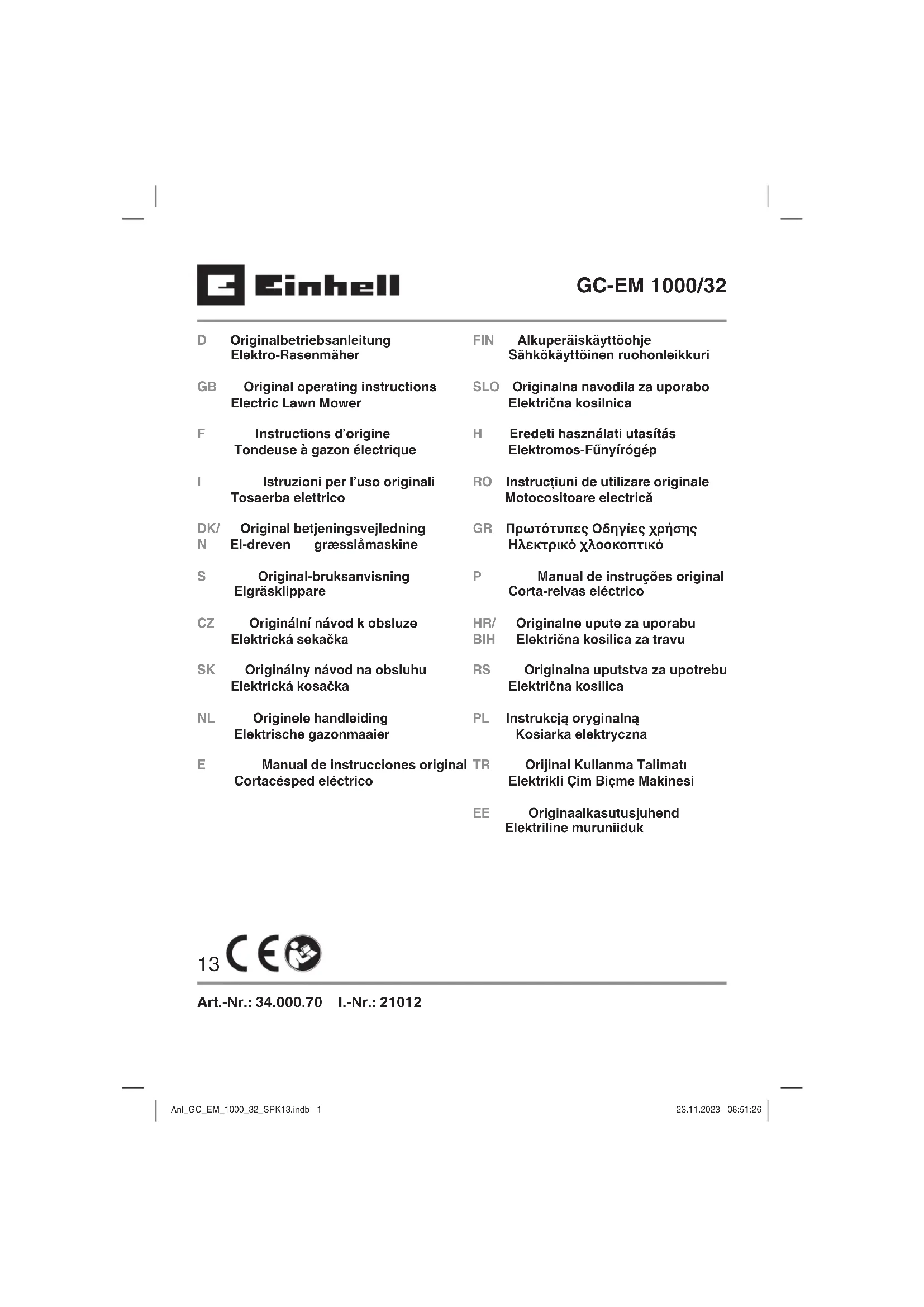 Uniquement pour les pays de l’Union Européenne Ne jetez pas les outils électriques dans les ordures ménagères! Selon la norme européenne 2012/19/CE relative aux appareils électriques et systèmes électroniques usés et selon son application dans le droit national, les outils électriques usés doivent être récoltés à part et apportés à un recyclage respectueux de l’environnement. Possibilité de recyclage en alternative à la demande de renvoi : Le propriétaire de l’appareil électrique est obligé, en guise d’alternative à un envoi en retour, à contribu- er à un recyclage eff ectué dans les règles de l’art en cas de cessation de la propriété. L’ancien appareil peut être remis à un point de collecte dans ce but. Cet organisme devra l’éliminer dans le sens de la Loi sur le cycle des matières et les déchets. Ne sont pas concernés les accessoires et ressources fournies sans composants électroniques. Veuillez noter que lors de la mise au rebut, les accumulateurs et les moyens d’éclairage (par ex. am- poule) sont retirés de l’appareil. Toute réimpression ou autre reproduction de la documentation et des papiers joints aux produits, même sous forme d’extraits, est uniquement permise une fois l’accord explicite de l’Einhell Germany AG obte- nu. Sous réserve de modifi cations techniques Anl_GC_EM_1000_32_SPK13.indb 36Anl_GC_EM_1000_32_SPK13.indb 36 23.11.2023 08:52:0523.11.2023 08:52:05F