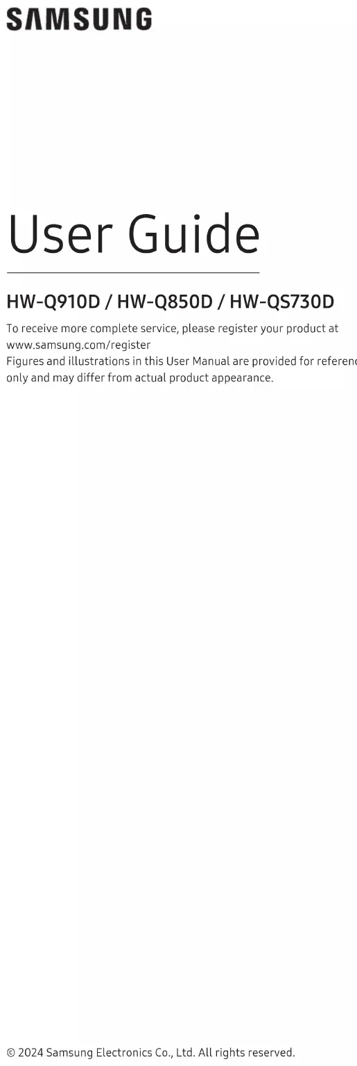 - The Spotify Software is subject to third party licenses found here: https://www.spotify.com/connect/third-party-licenses. Being Roon Tested means that Samsung and Roon have collaborated to ensure you have the best experience using Roon software and Samsung equipment together, so you can just enjoy the music. Open Source License Notice Open Source used in this product can be found on the following webpage (http://opensource.samsung.com).© 2024 Samsung Electronics Co., Ltd. Tous droits réservés. Guide d’utilisation HW-Q910D / HW-Q850D / HW-QS730D Pour bénécier d’un service plus complet, veuillez inscrire votre produit sur le site www.samsung.com/register Les chiffres et les illustrations contenus dans ce Guide d’utilisation sont fournis à titre de référence uniquement et pourraient ne pas représenter exactement le produit.FRC - 2 CONTENU 01 Vérication des composants 3 02 Présentation du produit 4 Panneau supérieur du Soundbar . . . . . . . . . . . . . . . . . . . . . . . . . . . . . . . . . . . . .4 Panneau inférieur du Soundbar. . . . . . . . . . . . . . . . . . . . . . . . . . . . . . . . . . . . . . 5 03 Utilisation de la télécommande du Soundbar 6 Insertion des piles avant d’utiliser la télécommande (2 piles AAA) . . . . .6 Comment utiliser la télécommande. . . . . . . . . . . . . . . . . . . . . . . . . . . . . . . . . .6 Réglage de (Commande du son). . . . . . . . . . . . . . . . . . . . . . . . . . . . . . . . . 7 Utilisation des boutons masqués (boutons ayant plusieurs fonctions) . .8 Spécications de sortie pour les différents modes d’effets sonores . . . . .8 Réglage du volume du Soundbar avec la télécommande du téléviseur 10 04 Connexion du Soundbar 11 Connexion de l’alimentation et des unités . . . . . . . . . . . . . . . . . . . . . . . . . . . 11 ‒ Branchement manuel du caisson de basse . . . . . . . . . . . . . . . . . . . . . . . 12 ‒ Voyants à DEL à l’arrière du caisson de basse . . . . . . . . . . . . . . . . . . . . 13 Connexion d’un haut-parleur ambiophonique sans l . . . . . . . . . . . . . . . .14 05 Connexion à un téléviseur 16 Connexion du téléviseur prenant en charge HDMI ARC (canal de retour audio) . . . . . . . . . . . . . . . . . . . . . . . . . . . . . . . . . . . . . . . . . . . . . . . . . . . . . . . . . . . .16 Connexion à l’aide d’un câble optique . . . . . . . . . . . . . . . . . . . . . . . . . . . . . . . 17 Connexion par Bluetooth. . . . . . . . . . . . . . . . . . . . . . . . . . . . . . . . . . . . . . . . . . .18 Connexion en Wi-Fi . . . . . . . . . . . . . . . . . . . . . . . . . . . . . . . . . . . . . . . . . . . . . . . .20 Utilisation de la fonction Q-Symphony . . . . . . . . . . . . . . . . . . . . . . . . . . . . . . 21 Utilisation du SpaceFit Sound . . . . . . . . . . . . . . . . . . . . . . . . . . . . . . . . . . . . . .22 06 Connexion d’un appareil externe 23 Méthode 1. Connexion à l’aide d’un câble HDMI (décodage et lecture Dolby Atmos / DTS:X possible). . . . . . . . . . . . . . . . . . . . . . . . . . . . . . . . . . . . . .23 Méthode 2. Connexion à l’aide d’un câble optique . . . . . . . . . . . . . . . . . . . .24 07 Connexion d’un appareil mobile 25 Méthode 1. Connexion par Bluetooth. . . . . . . . . . . . . . . . . . . . . . . . . . . . . . . .25 Méthode 2. Connexion par Wi-Fi (réseau sans l). . . . . . . . . . . . . . . . . . . . .27 Utilisation de Group Play. . . . . . . . . . . . . . . . . . . . . . . . . . . . . . . . . . . . . . . . . . .27 Connexion par Apple AirPlay . . . . . . . . . . . . . . . . . . . . . . . . . . . . . . . . . . . . . . .28 Utilisation de la fonction Tap Sound. . . . . . . . . . . . . . . . . . . . . . . . . . . . . . . . .28 08 Installation du support mural 29 Précautions d’installation . . . . . . . . . . . . . . . . . . . . . . . . . . . . . . . . . . . . . . . . . .29 Composants de montage mural . . . . . . . . . . . . . . . . . . . . . . . . . . . . . . . . . . . .29 09 Installation du Soundbar devant le téléviseur 30 Composant . . . . . . . . . . . . . . . . . . . . . . . . . . . . . . . . . . . . . . . . . . . . . . . . . . . . . . 30 10 Mise à jour du logiciel 31 Mise à jour automatique . . . . . . . . . . . . . . . . . . . . . . . . . . . . . . . . . . . . . . . . . . . 31 Mise à jour USB. . . . . . . . . . . . . . . . . . . . . . . . . . . . . . . . . . . . . . . . . . . . . . . . . . . . 31 Initialisation . . . . . . . . . . . . . . . . . . . . . . . . . . . . . . . . . . . . . . . . . . . . . . . . . . . . . .32 11 Dépannage 32 12 Licence 34FRC - 3