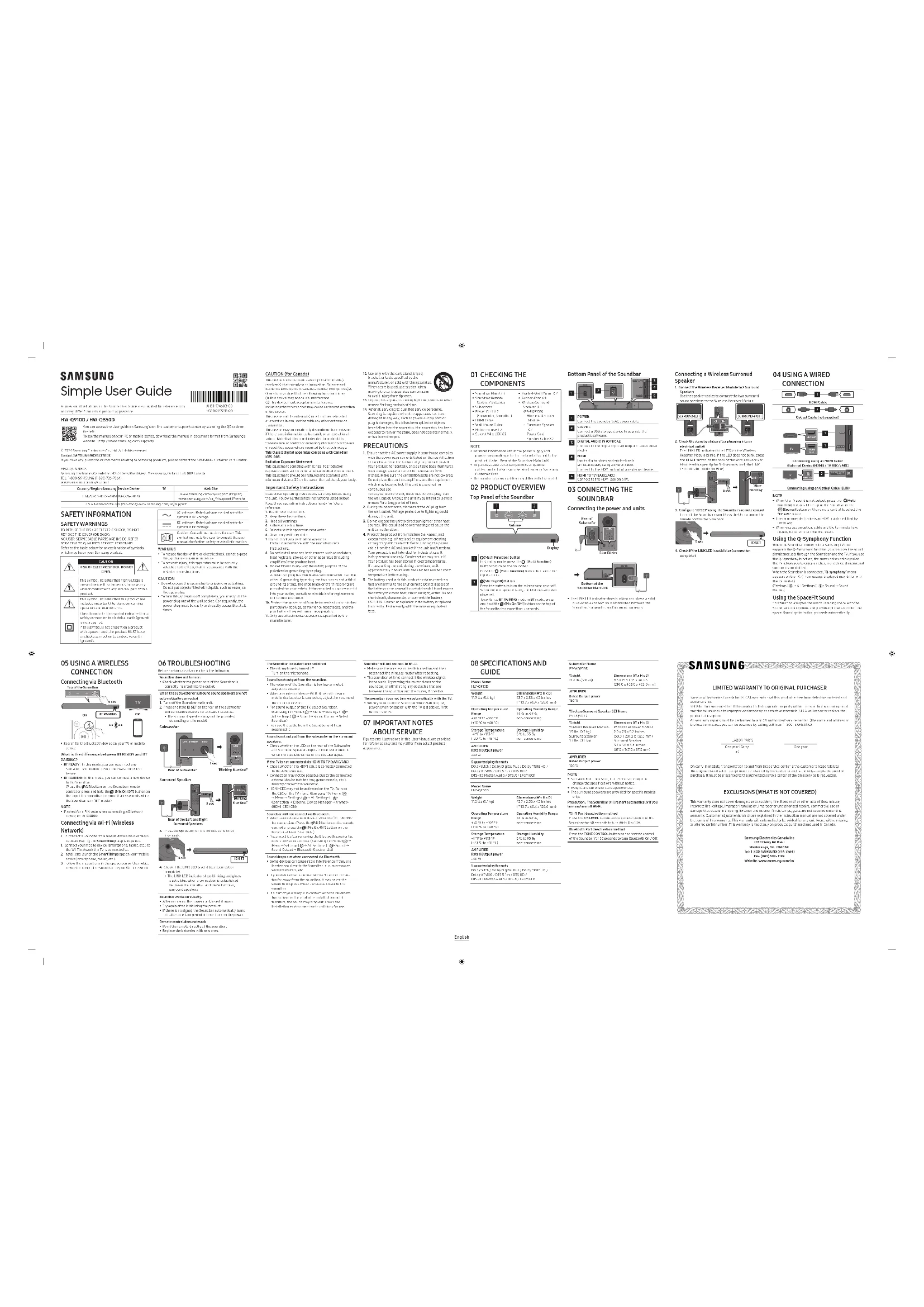 Samsung Electronics Canada Inc. (SECA) garantit ce produit contre tout défaut de fabrication.SECA garantit aussi que si cet appareil ne fonctionne pas convenablement durant la période de garantie SECA se réservera le droit de réparer ou de remplacer l’appareil défectueux.Toutes les réparations sous garantie doivent être effectuées par un Centre de service autorisé SECA. Le nom et l’adresse du Centre de service le plus près de chez vous peut être obtenu en composant sans frais le 1- 800- SAMSUNG ou en visitant notre site web au www.samsung.caMAIN-D’OEUVRE PIÈCESUN (1) AN (AU COMPTOIR) UN (1) ANPour tous les modèles portatifs, le transport de l’appareil sera la responsabilité du client.Le reçu de vente original doit être conservé par le client car cela constitue la seule preuve d’achat acceptée. Le client doit le présenter au Centre de service agréé au moment où il fait la demande d’une réparation sous garantie. EXCLUSIONS (CE QUI N’EST PAS COUVERT) Cette garantie ne couvre pas les dommages causés par un accident, un incendie, une inondation, un cas de force majeure, un mauvais usage ou une tension incorrecte. La garantie ne couvre pas une mauvaise installation, une mauvaise réparation, une réparation non autorisée et tout usage commercial ou dommages survenus durant le transport. Le ni extérieur et intérieur de même que les lampes ne sont pas couverts par cette garantie. Les ajustements par le client qui sont expliqués dans le guide de l’utilisateur ne sont pas couverts en vertu de cette garantie. Cette garantie sera automatiquement annulée pour tout appareil qui aurait un numéro de série manquant ou modié. Cette garantie est valable seulement sur les appareils achetés et utilisés au Canada.Samsung Electronics Canada Inc2050 Derry Rd WestMississauga, On. L5N 0B9Tel: 1-800-SAMSUNG (726-7864)Fax: (905) 542- 1199Website: http://www.samsung.com/ca_fr Guide d’utilisation simple Les gures et les illustrations contenus dans ce guide d’utilisation simple sont fournies à titre de référence uniquement et pourraient ne pas représenter exactement le produit.AH81-17460B-00 NSPBI01558B-00 HW-Q910D / HW-Q850D Vous pouvez accéder au guide d’utilisation sur le centre de soutien à la clientèle de Samsung disponible en ligne en balayant le code QR situé à gauche. Pour consulter le manuel sur votre PC ou appareil mobile, téléchargez le manuel en format document sur le site Web de Samsung. (http://www.samsung.com/support)© 2024 Samsung Electronics Co., Ltd. Tous droits réservés.Contacter SAMSUNG WORLDWIDE Pour toute question ou commentaire concernant un produit Samsung, veuillez communiquer avec le centre de service à la clientèle SAMSUNG.SIÈGE SOCIALSamsung Electronics Canada Inc. 2050 Derry Road West, Mississauga, Ontario L5N 0B9 CanadaTÉL. : 1-800-SAMSUNG (1-800-726-7864)www.samsung.com/ca/supportPays/Région Centre de service de Samsung Site WebCANADA 1-800-SAMSUNG(726-7864)www.samsung.com/ca/support (English)www.samsung.com/ca_fr/support (French)U.S.A 1-800-SAMSUNG (726-7864) www.samsung.com/us/support INFORMATIONS RELATIVES À