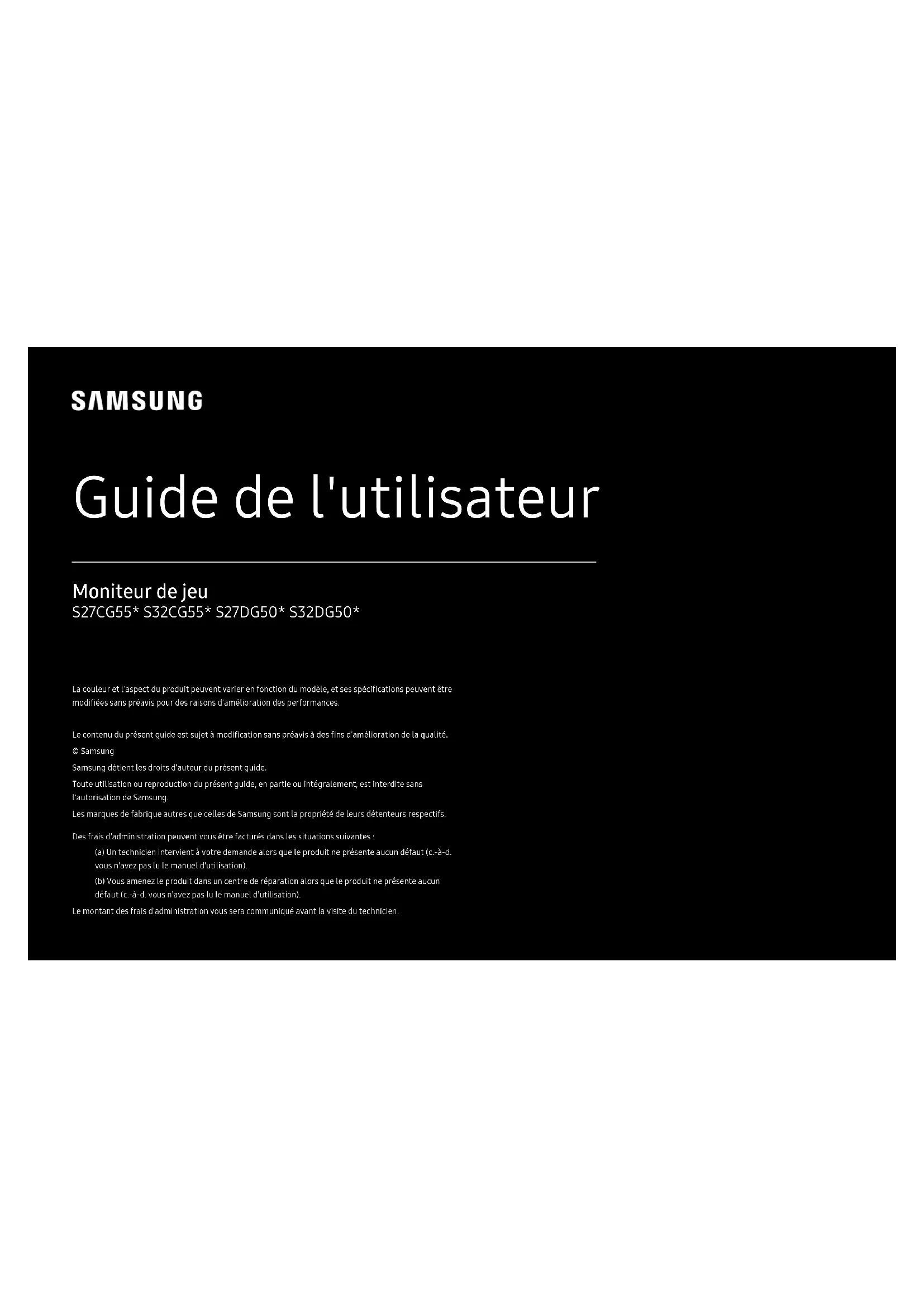 Guide de l'utilisateur Moniteur de jeu S27CG55* S32CG55* S27DG50* S32DG50* La couleur et l'aspect du produit peuvent varier en fonction du modèle, et ses spécifications peuvent être modifiées sans préavis pour des raisons d'amélioration des performances. Le contenu du présent guide est sujet à modification sans préavis à des fins d'amélioration de la qualité. © Samsung Samsung détient les droits d'auteur du présent guide. Toute utilisation ou reproduction du présent guide, en partie ou intégralement, est interdite sans l'autorisation de Samsung. Les marques de fabrique autres que celles de Samsung sont la propriété de leurs détenteurs respectifs. Des frais d'administration peuvent vous être facturés dans les situations suivantes: (a) Un technicien intervient à votre demande alors que le produit ne présente aucun défaut (c.-à-d. vous n'avez pas lu le manuel d'utilisation). (b) Vous amenez le produit dans un centre de réparation alors que le produit ne présente aucun défaut (c.-à-d. vous n'avez pas lu le manuel d'utilisation). Le montant des frais d'administration vous sera communiqué avant la visite du technicien.Table des matières Avant utilisation du produit Consignes de sécurité 4 Électricité et sécurité 4 Installation 5 Fonctionnement 6 Nettoyage 8 Position correcte lors de l'utilisation du produit 8 Préparatifs Installation 9 Fixation du socle 9 Démontage du pied 11 Précautions lors du déplacement du produit 11 Vérification de l'espace autour du produit 12 Ajustement de l'inclinaison et de la hauteur du produit 13 Rotation du produit 15 Verrou antivol 16 Spécifications du kit de montage mural (VESA) 17 Panneau de configuration 18
