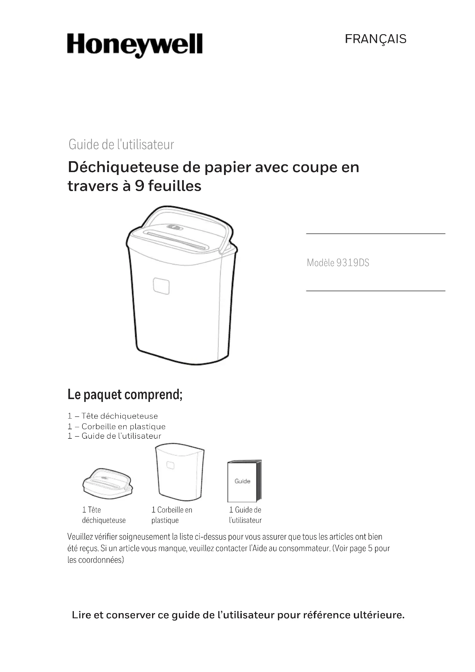 Lire et conserver ce guide de l’utilisateur pour référence ultérieure. FRANÇAIS Guide de l'utilisateur Déchiqueteuse de papier avec coupe en travers à 9 feuilles Le paquet comprend; Veuillez vérifier soigneusement la liste ci-dessus pour vous assurer que tous les articles ont bien été reçus. Si un article vous manque, veuillez contacter l’Aide au consommateur. (Voir page 5 pour les coordonnées) Modèle 9319DS 1 – Tête déchiqueteuse1 – Corbeille en plastique1 – Guide de l’utilisateur1 Guide de l'utilisateur1 Tête déchiqueteuse1 Corbeille en plastiqueSOMMAIRE