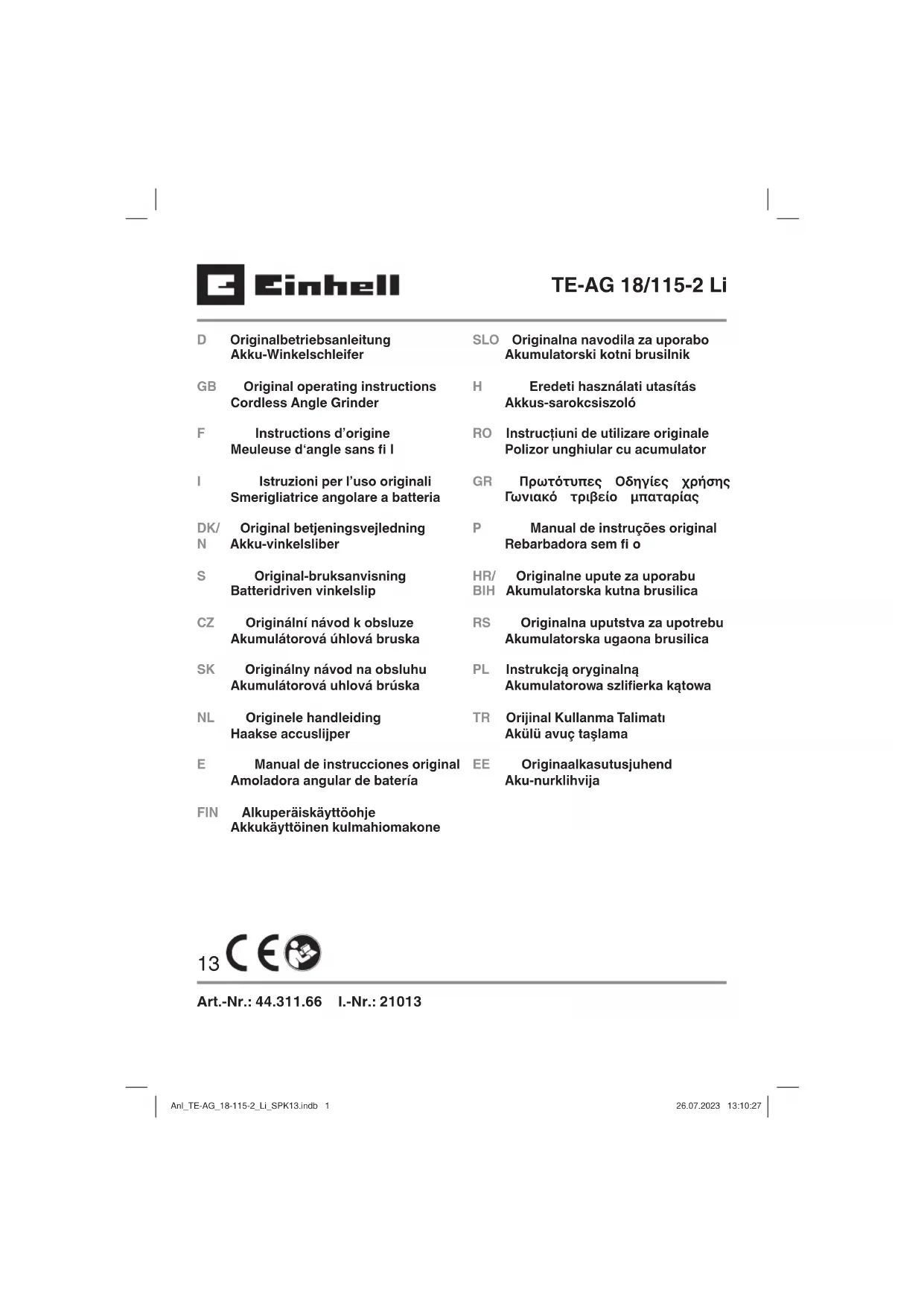 Retrouvez gratuitement la notice de l'appareil TE-AG 18/115-2 Li EINHELL au format PDF.