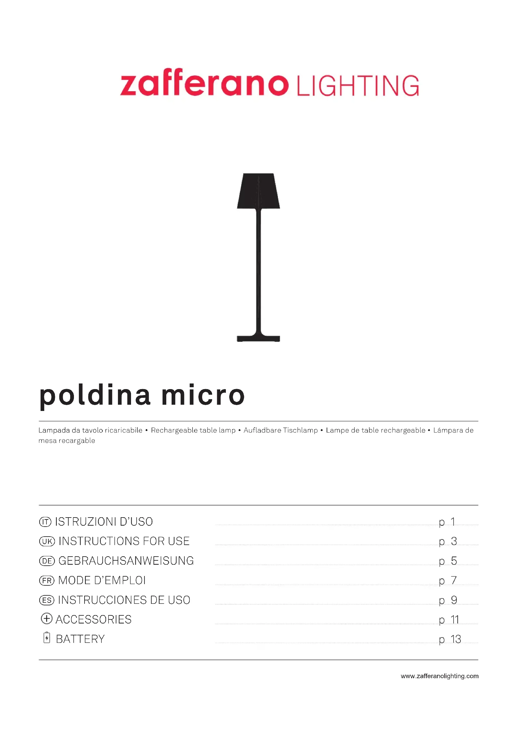- Le plan d’appui de la lampe ne doit pas dépasser 15° d’inclinaison, sinon elle risque de tomber. - La batterie est munie de la fonction de protection contre les surcharges. - Pour préserver l’intégrité de la batterie, il est conseillé de maintenir la charge entre 20% minimum et 80% maximum; si la lampe n’est pas utilisée pendant de longues périodes, il est conseillé de procéder périodiquement à un cycle de charge/décharge du produit. - Se référer aux lois locales pour une élimination correcte et le recyclage de la batterie. DESIGNED BY ZAFFERANO SRL IN ITALY, MADE IN PRC • For product and sales Inquiries: zafferanolighting.com