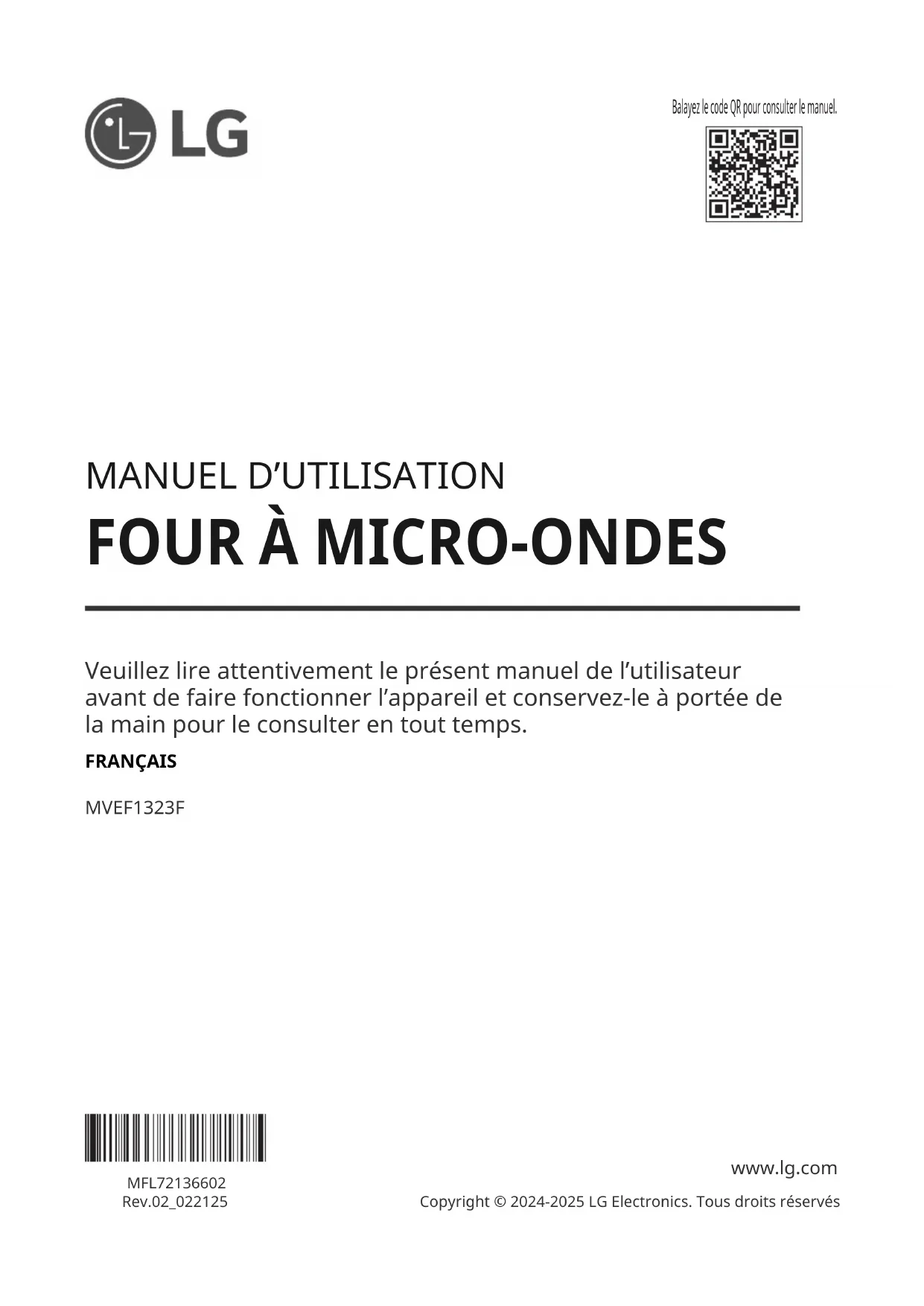 FOUR À MICRO-ONDES Veuillez lire attentivement le présent manuel de lʼutilisateur avant de faire fonctionner lʼappareil et conservez-le à portée de la main pour le consulter en tout temps. FRANÇAIS MVEF1323F MFL72136602Rev.02_022125 www.lg.com Copyright © 2024-2025 LG Electronics. Tous droits réservés Balayez le code QR pour consulter le manuel.TABLE DES MATIÈRES
