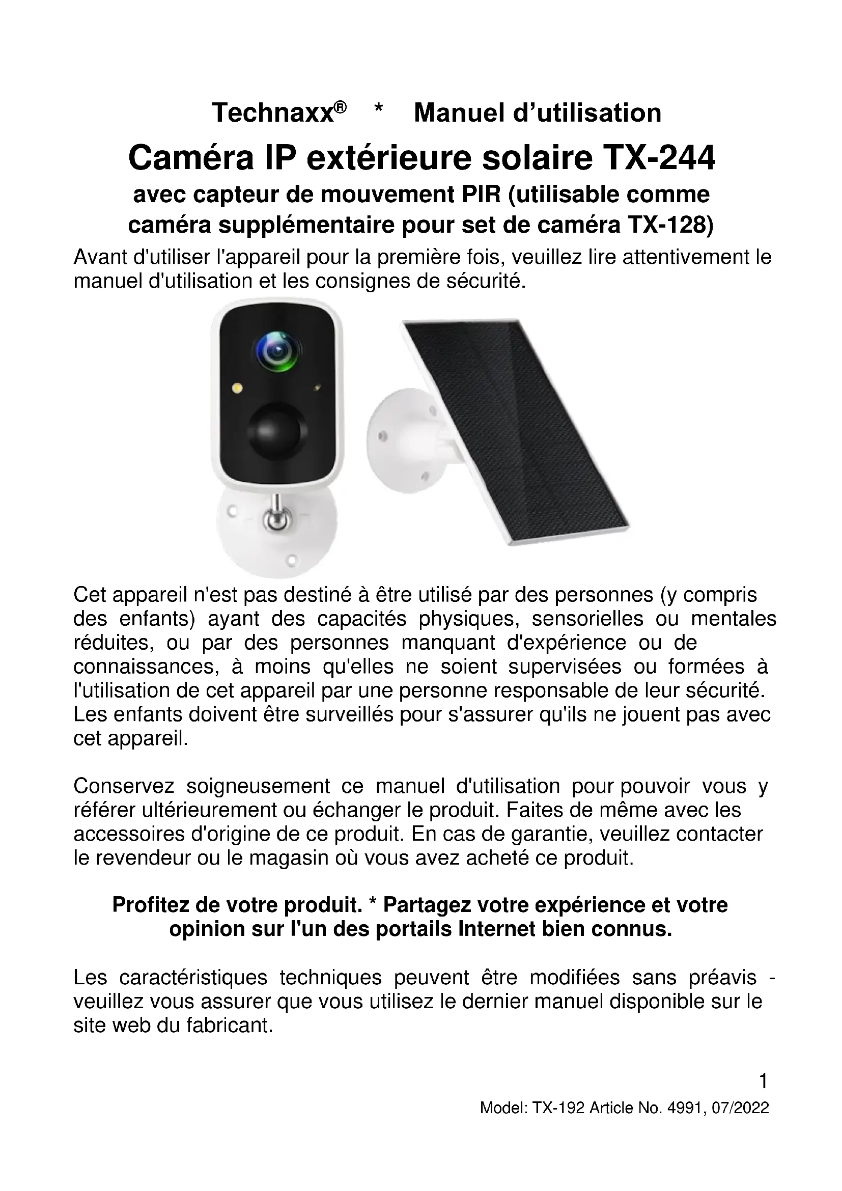 - Manuel d’utilisation Caméra IP extérieure solaire TX-244 avec capteur de mouvement PIR (utilisable comme caméra supplémentaire pour set de caméra TX-128) Avant d'utiliser l'appareil pour la première fois, veuillez lire attentivement le manuel d'utilisation et les consignes de sécurité. Cet appareil n'est pas destiné à être utilisé par des personnes (y compris des enfants) ayant des capacités physiques, sensorielles ou mentales réduites, ou par des personnes manquant d'expérience ou de connaissances, à moins qu'elles ne soient supervisées ou formées à l'utilisation de cet appareil par une personne responsable de leur sécurité. Les enfants doivent être surveillés pour s'assurer qu'ils ne jouent pas avec cet appareil. Conservez soigneusement ce manuel d'utilisation pour pouvoir vous y référer ultérieurement ou échanger le produit. Faites de même avec les accessoires d'origine de ce produit. En cas de garantie, veuillez contacter le revendeur ou le magasin où vous avez acheté ce produit. Profitez de votre produit. * Partagez votre expérience et votre opinion sur l'un des portails Internet bien connus. Les caractéristiques techniques peuvent être modifiées sans préavis - veuillez vous assurer que vous utilisez le dernier manuel disponible sur le site web du fabricant.2 Model: TX-192 Article No. 4991, 07/2022 Table of Contents Conseils ...................................... 3 Consignes de sécurité ................ 3 Règles de sécurité pour les piles rechargeables ............................. 4 Avertissements ........................... 4 Note d’information sur la protection des données personnelles ............................... 5 Clause de non-responsabilité ..... 6 Caractéristiques ......................... 7 Aperçu du produit ....................... 8 Caméra ............................... 8 Panneau solaire ......................... 8 Instructions relatives aux voyants (LED) et aux boutons ................. 9 Voyant d’état ....................... 9 Voyant de charge = Voyant d’état (avant) ....................... 9 Fonctionnement des boutons