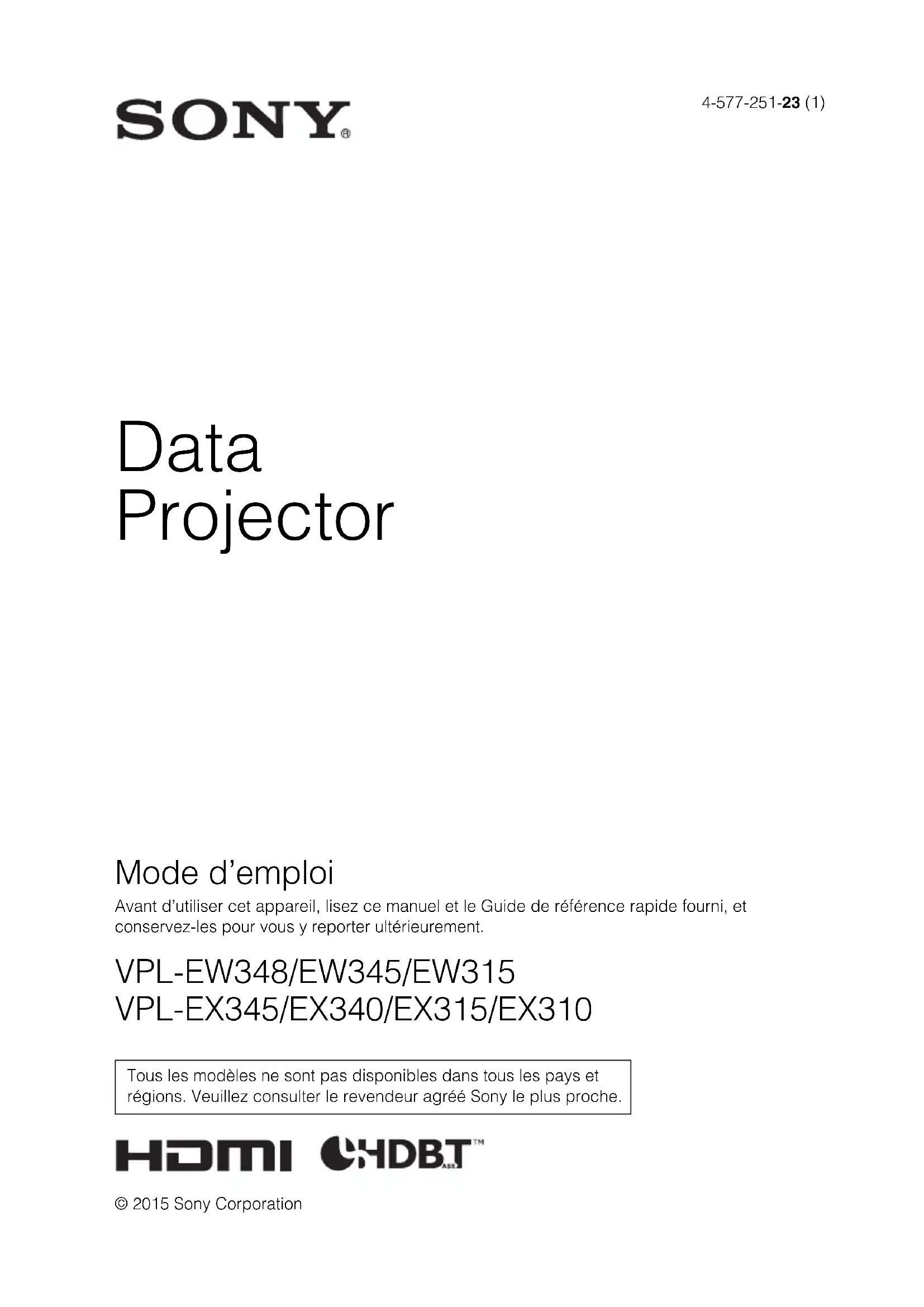4-577-251-23 (1) © 2015 Sony Corporation Data Projector Mode d’emploi Avant d’utiliser cet appareil, lisez ce manuel et le Guide de référence rapide fourni, et conservez-les pour vous y reporter ultérieurement.