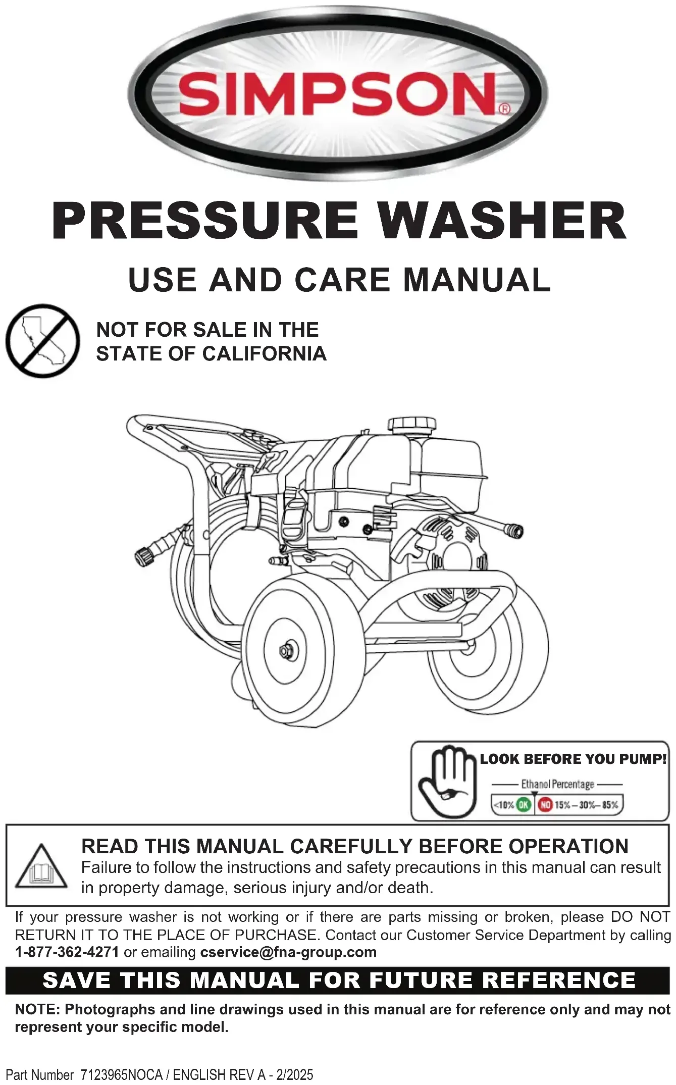Copyright © 2025 FNA-Group, Inc. All rights reserved.No. de pièce 7123965NOCA / FRANÇAIS REV A – 2/2025 CONSERVEZ CE GUIDE POUR RÉFÉRENCE ULTÉRIEURE LIRE ATTENTIVEMENT CE GUIDE AVANT L’UTILISATION Le fait de ne pas suivre les instructions et les précautions de sécurité de ce guide peut entraîner des dommages matériels, des blessures graves et/ou la mort. REMARQUE : Les photographies et les schémas utilisés dans ce guide sont donnés à titre indicatif uniquement et peuvent ne pas représenter votre modèle spécique.Si le laveur sous pression ne fonctionne pas ou si des pièces sont manquantes ou endommagées, veuillez NE PAS LE RETOURNER AU LIEU D’ACHAT. Contactez notre service à la clientèle par téléphone au 1 877 362-4271 ou par courriel à cservice@fna-group.com REGARDEZ AVANT DE POMPER! Pourcentage d'éthanol