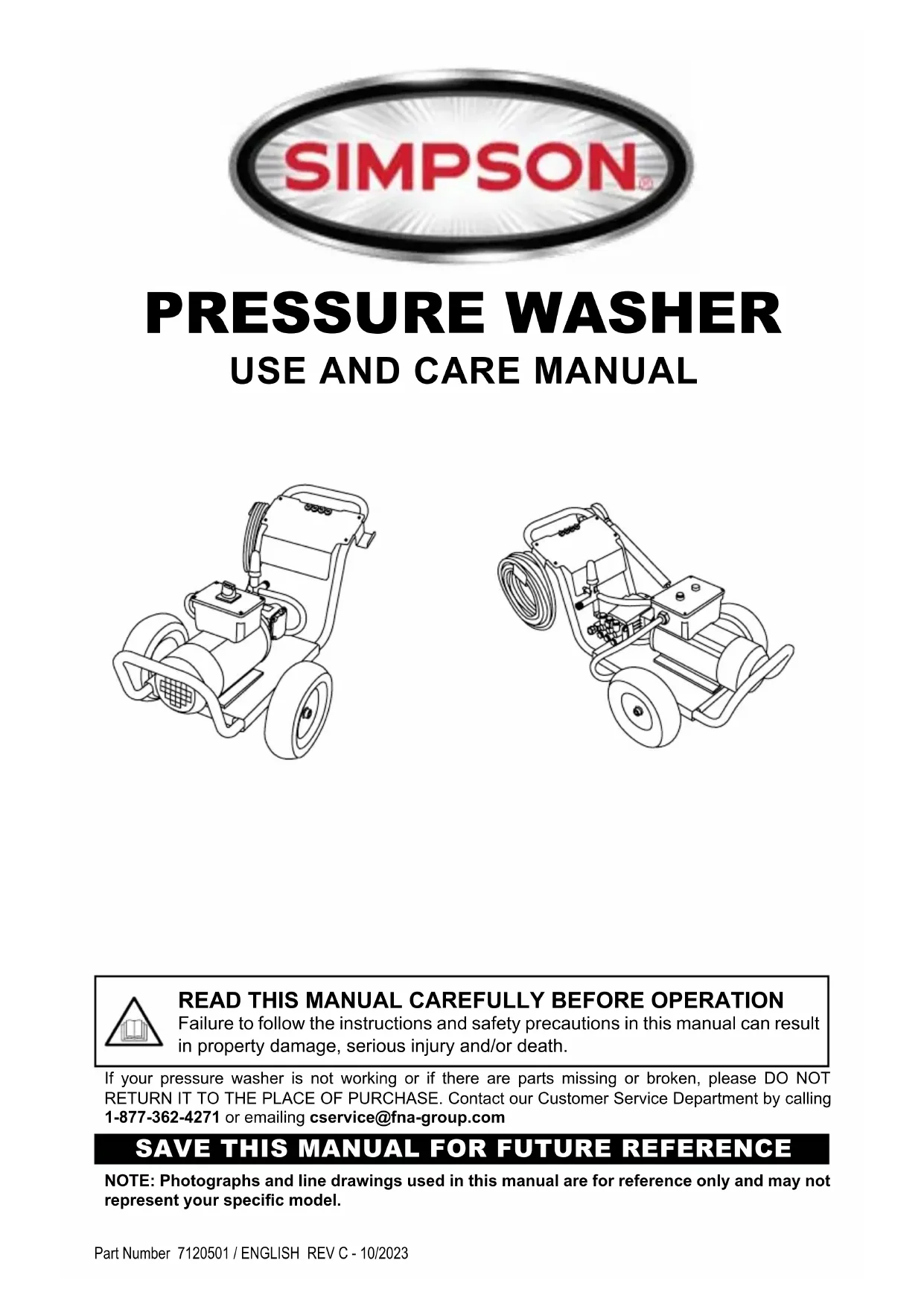 LIRE ATTENTIVEMENT CE GUIDE AVANT L’UTILISATION Le fait de ne pas suivre les instructions et les précautions de sécurité de ce guide peut entraîner des dommages matériels, des blessures graves et/ou la mort. REMARQUE : Les photographies et les schémas utilisés dans ce guide sont donnés à titre indicatif uniquement et peuvent ne pas représenter votre modèle spécique. Si le laveur sous pression ne fonctionne pas ou si des pièces sont manquantes ou endommagées, veuillez NE PAS LE RETOURNER AU LIEU D’ACHAT. Contactez notre service à la clientèle par téléphone au 1 877 362-4271 ou par courriel à cservice@fna-group.comPage II REMARQUES CETTE PAGE A ÉTÉ INTENTIONNELLEMENT LAISSÉE BLANCHEPage 1 CONSERVER CE GUIDE POUR UNE UTILISATION ULTÉRIEURE Notez le numéro de modèle, le numéro de série et la date d’achat de ce produit dans les espaces prévus ci-dessous, puis conservez ce guide avec le(s) reçu(s) d’achat pour toute référence ultérieure. Conservez ce guide pour toute référence ultérieure. Ce guide doit être considéré comme faisant partie intégrante du produit et doit être conservé avec celui-ci. Ce guide doit être mis à la disposition de toute personne utilisant le(s) produit(s) qu’il couvre. Ce guide doit être conservé avec le(s) produit(s) concerné(s) en cas de vente à un nouveau propriétaire. Si le guide est endommagé, perdu ou inutilisable, vous pouvez télécharger une nouvelle copie à partir des pages du produit à l’adresse www.simpsoncleaning.com ou contacter le service clientèle en appelant le 1 877 362-4271. Numéro de modèle : Numéro de série : Date d’achat :Page 2