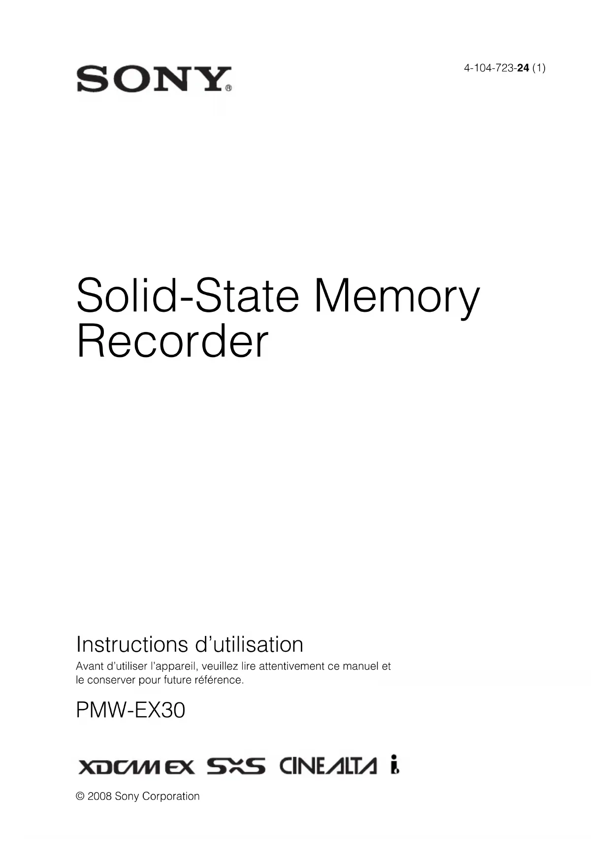 © 2008 Sony Corporation Solid-State Memory Recorder Instructions d’utilisation Avant d’utiliser l’appareil, veuillez lire attentivement ce manuel et le conserver pour future référence. PMW-EX30 4-104-723-24 (1)2 Afin de réduire les risques d’incendie ou d’électrocution, ne pas exposer cet appareil à la pluie ou à l’humidité. Afin d’écarter tout risque d’électrocution, garder le coffret fermé. Ne confier l’entretien de l’appareil qu’à un personnel qualifié. ATTENTION Eviter d’exposer l’appareil à un égouttement ou à des éclaboussures. Ne placer aucun objet rempli de liquide, comme un vase, sur l’appareil. Ne pas installer l’appareil dans un endroit confiné, par exemple une bibliothèque ou un placard encastré. AVERTISSEMENT L’adaptateur CA fourni ne possède pas d’interrupteur d’alimentation. Lors de l’installation de l’appareil, incorporer un dispositif de coupure dans le câblage fixe ou brancher la fiche d’alimentation dans une prise murale facilement accessible proche de l’appareil. En cas de problème lors du fonctionnement de l’appareil, enclencher le dispositif de coupure d’alimentation ou débrancher la fiche d’alimentation. Une pression acoustique excessive en provenance des écouteurs ou du casque peut provoquer une baisse de l’acuité auditive. Pour utiliser ce produit en toute sécurité, évitez l’écoute prolongée à des pressions sonores excessives. IMPORTANT La plaque signalétique se situe sous l’appareil. Pour les clients au Canada Cet appareil numérique de la classe A est conforme à la norme NMB-003 du Canada. Pour les clients en Europe Ce produit portant la marque CE est conforme à la Directive sur la compatibilité électromagnétique (EMC) émise par la Commission de la Communauté européenne. La conformité à cette directive implique la conformité aux normes européennes suivantes :