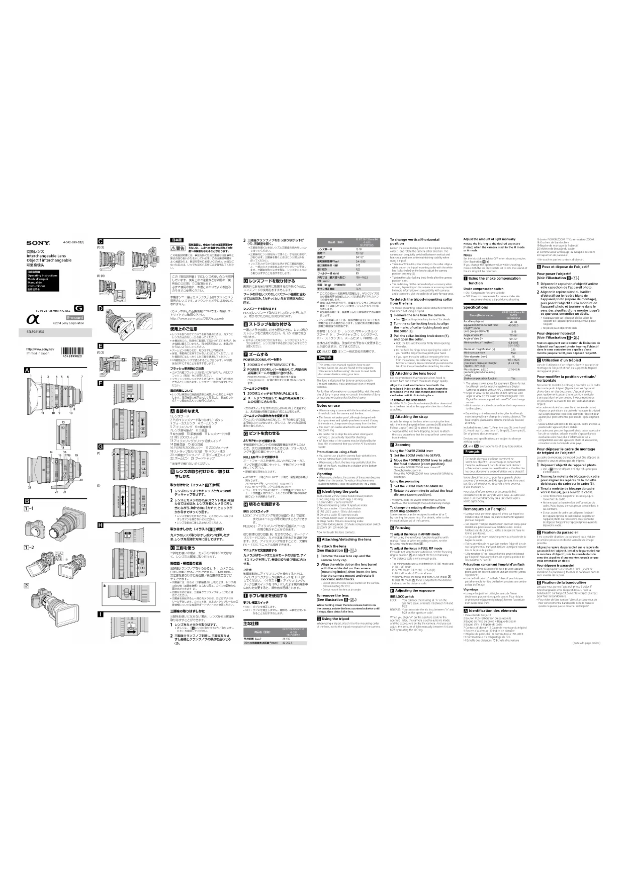 LOCKRELEASEIRIS LOCK(Suite de la page avant)Pour régler la mise au point en mode FULL Pour ne pas utiliser la fonction de mise au point automatique, réglez la bague de mise au point sur la position et réglez la mise au point manuellement. L’échelle des distances doit uniquement être utilisée comme guide sommaire. Les mises au point minimales varient entre les modes AF/MF et FULL MF. En mode AF/MF : 0,4 m (W) – 0,95 m (T) En mode FULL MF : 0,95 m dans toutes les zones Lors du déplacement de la bague de mise au point du mode AF/MF au mode FULL MF , la mise au point est réglée sur la distance indiquée par l’échelle des distances. Réglage de l’exposition Commutateur IRIS LOCK LOCK : vous pouvez bloquer la bague d’iris sur «A» sur l’échelle d’ouverture, ou la tourner de f/4 à f/22.RELEASE : vous pouvez tourner la bague d’iris de «A» à f/22 sur l’échelle d’ouverture.Lorsque vous alignez «A» de l’échelle d’ouverture sur le repère d’ouverture, l’appareil photo est réglé en mode iris automatique et l’exposition est réglée par l’appareil photo. Vous pouvez régler la quantité de lumière manuellement entre f/4 et f/22 en tournant la bague d’iris.Réglage manuel de la quantité de lumière Faites pivoter la bague d’iris sur l’exposition voulue (f-stop) lorsque l’appareil photo est en mode M ou A. Remarques Réglez le commutateur d’encliquetage de l’iris sur OFF lors de l’enregistrement de vidéos. (Voir l’illustration -a)Si vous changez la valeur d’ouverture pendant l’enregistrement d’une vidéo avec le commutateur d’encliquetage de l’iris réglé sur ON, le bruit émis par la bague d’ouverture sera enregistré. Utilisation de la fonction antibougé Commutateur antibougé ON : compense les tremblements de l’appareil photo. OFF : ne compense pas les tremblements de l’appareil photo. Nous conseillons d’utiliser un trépied lors de la prise de photos. Spécifications Nom (Nom de modèle)FE PZ 28-135mm F4 G OSSSELP28135GLongueur focale (mm)28-135Focale équivalente en format 35 mm* (mm)42-202,5Éléments-groupes de lentilles12-18Angle de vue 1* 75°-18°Angle de vue 2* 54°-12°Mise au point minimale*