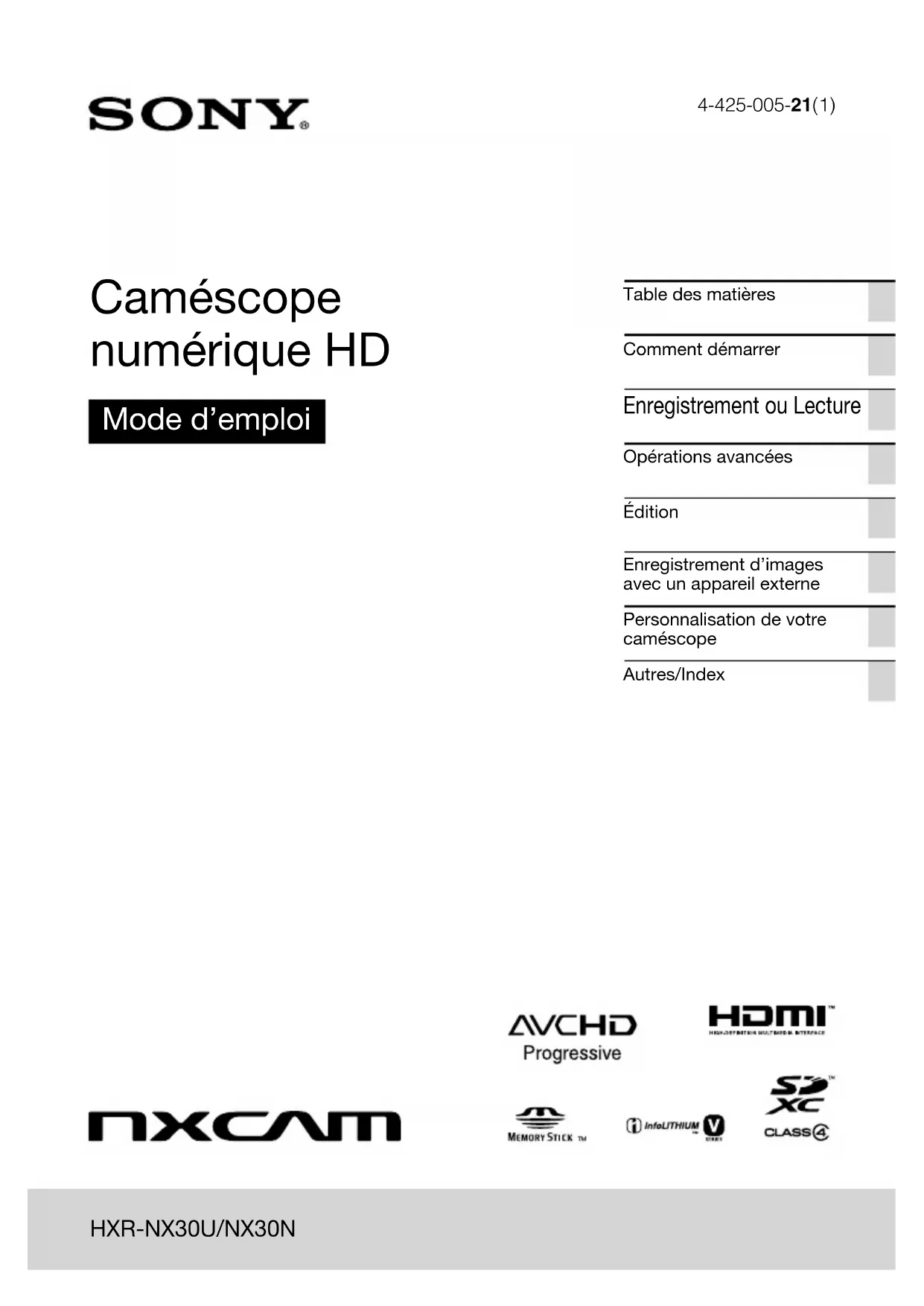 HXR-NX30N - Caméra vidéo SONY - Notice d'utilisation et mode d'emploi gratuit