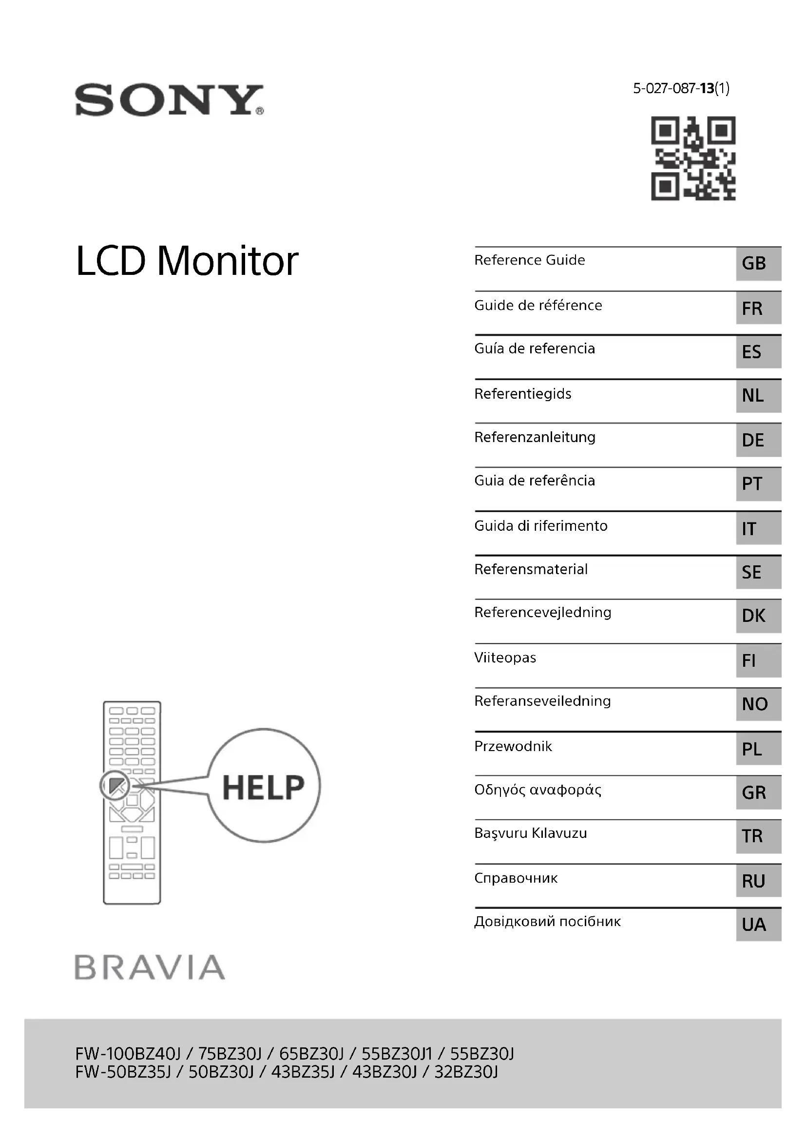 - Consignes de sécurité, télécommande, dépannage, fixation murale, spécifications, etc. Aide Vous trouverez des renseignements supplémentaires sur le dépannage et d’autres informations utiles directement sur votre Moniteur LCD. Appuyez sur HELP sur la télécommande pour afficher une liste de thèmes. IMPORTANT – Lisez le Contrat de licence logicielle de l’utilisateur final avant d’utiliser votre produit Sony. Utiliser votre produit indique vous avez accepté le Contrat de licence logicielle de l’utilisateur final. Le contrat de licence logicielle entre vous et Sony est disponible en ligne sur le site Web Sony https://www.sony.net/tv-software-licenses/) ou sur l’écran de votre produit. Allez dans [Paramètres] t [Système] t [À propos] t [Informations légales] t [Avis et licences]. AVIS IMPORTANT Consignes de sécuritéD:\_SONY TV\SY21_B2B_EU_RG_131\5027087131\02FR\5027087131_02FR.fm master page: Right FW-100BZ40J / 75BZ30J / 65BZ30J / 55BZ30J1 / 55BZ30J / 50BZ35J / 50BZ30J / 43BZ35J / 43BZ30J / 32BZ30J 5-027-087-13(1)