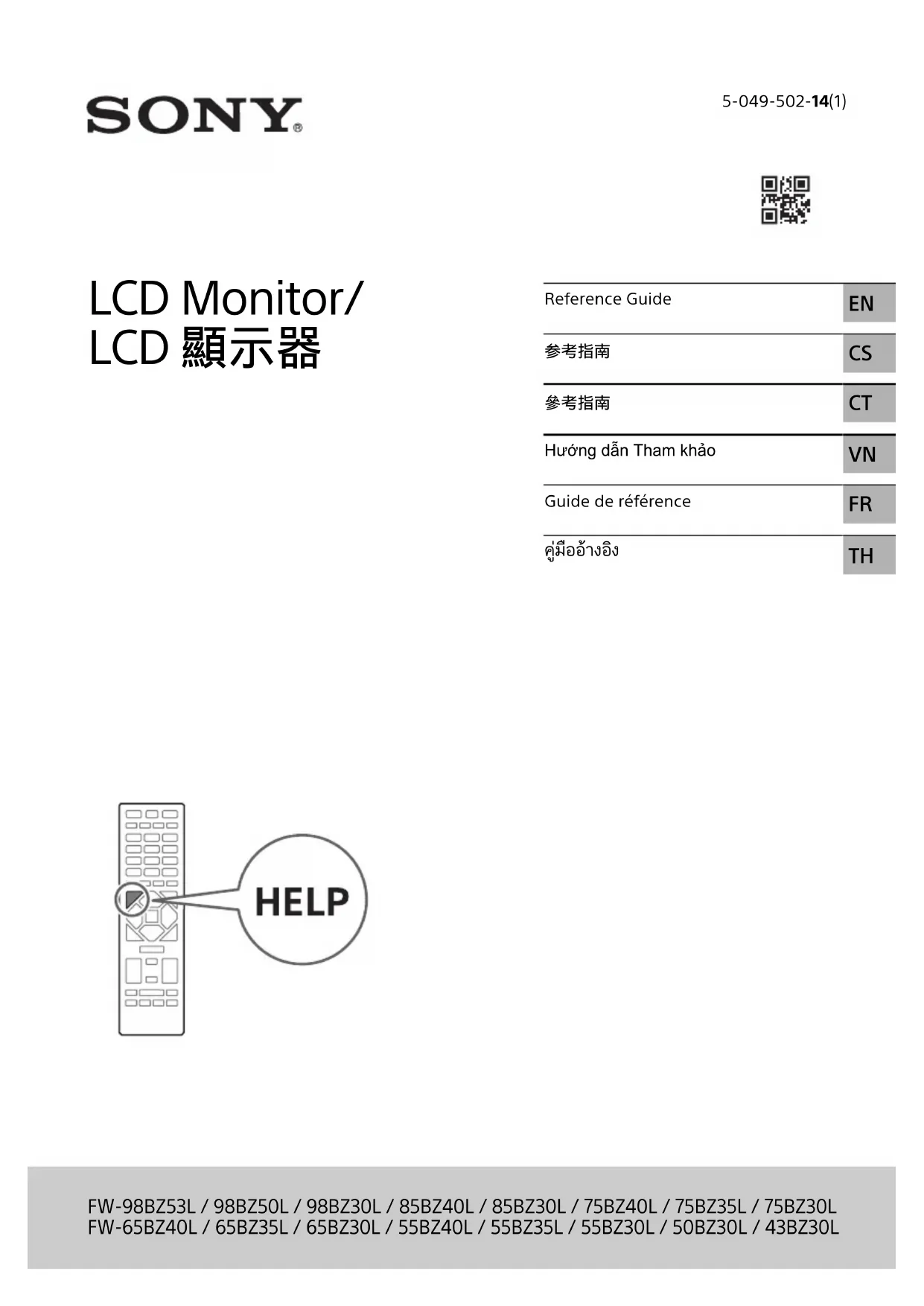 - Consignes de sécurité, télécommande, dépannage, fixation murale, spécifications, etc. Aide Vous trouverez des renseignements supplémentaires sur le dépannage et d’autres informations utiles directement sur votre Moniteur LCD. Appuyez sur HELP sur la télécommande pour afficher une liste de thèmes. IMPORTANT – Lisez le Contrat de licence logicielle de l’utilisateur final avant d’utiliser votre produit Sony. Utiliser votre produit indique vous avez accepté le Contrat de licence logicielle de l’utilisateur final. Le contrat de licence logicielle entre vous et Sony est disponible en ligne sur le site Web Sony (https://www.sony.net/tv-software-licenses/) ou sur l’écran de votre produit. Allez dans [Paramètres] t [Système] t [À propos de] t [Informations légales] t [Avis et licences]. Consignes de sécuritéD:\@ Jobs\SY23_B2B_PA_RG_141\5049502141_05FR\5049502141_05FR.fm master page: Right FW-98BZ53L / 98BZ50L / 98BZ30L / 85BZ40L / 85BZ30L / 75BZ40L / 75BZ35L / 75BZ30L / 65BZ40L / 65BZ35L / 65BZ30L / 55BZ40L / 55BZ35L / 55BZ30L / 50BZ30L / 43BZ30L 5-049-502-14(1)