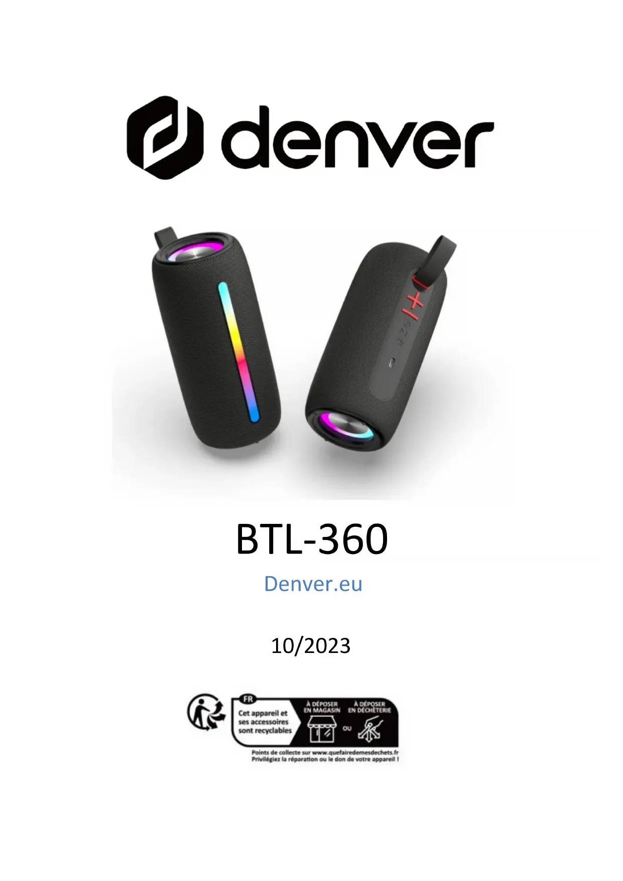 BTL-360 Denver.eu 10/20232 Consignes de sécurité Lisez attentivement les consignes de sécurité avant d’utiliser le produit pour la première fois et conservez-les pour référence ultérieure. 1.Ce produit n’est pas un jouet. Maintenez-le hors de portée des enfants. 2.Avertissement : Ce produit contient des batteries au lithium-polymère 3.Gardez le produit hors de la portée des enfants et des animaux de compagnie pour éviter qu’ils les mordent et les avalent. 4.La température de fonctionnement et de rangement du produit est comprise entre 0 et 40 degrés Celsius. Une température inférieure ou supérieure peut affecter le fonctionnement. 5.N’ouvrez jamais le produit. Toucher les pièces électriques à l’intérieur peut provoquer une décharge électrique. Les réparations ou l’entretien doivent toujours être effectués par du personnel qualifié. 6.N’exposez pas l’appareil à la chaleur, l’eau, l’humidité et la lumière directe du soleil ! 7.Préservez vos oreilles d’un volume sonore élevé. Un volume sonore élevé peut endommager les oreilles et causer une perte d’acuité auditive. 8.La technologie sans fil Bluetooth peut fonctionner à une portée de 10 mètres (30 pieds). La distance de3 communication maximale peut varier selon la présence d’obstacles (personnes, objets métalliques, murs, etc.) ou de l’environnement électromagnétique. 9.Les micro-ondes émises par un appareil Bluetooth peuvent affecter le fonctionnement des appareils médicaux électroniques. 10.L’unité n’est pas étanche. Si de l’eau ou des objets pénètrent dans l’unité, cela peut causer un incendie ou une électrocution. Si de l’eau ou un objet pénètre dans l’unité, cessez immédiatement l’utilisation. 11.Ne chargez l’appareil qu’avec le câble USB inclus. 12.N’utilisez pas d’accessoires non officiels avec le produit, car cela peut causer un mauvais fonctionnement. Contenu 1 Enceinte 1 Câble de charge Type-C 1 Câble Entrée auxiliaire 1 Mode d’emploi Données techniques Version Bluetooth: V5.3 Entrée nominale: 5V-500mA Haut-parleur: 2 x 5 W Batterie: 1200 mAh Plage de fréquences: 100 Hz – 18 KHz Portée du Bluetooth: Jusqu’à 10 mètres4 Vue d’ensemble du produit 1.Sangle noire 2.Bouton VOL+/Morceau suivant 3.Bouton VOL-/Morceau précédent 4.Marche-Arrêt/Mains libres 5.Mode Bluetooth, Entrée Aux, USB, TF/TWS (Appuyez deux fois pour la connexion TWS) 6.Mode d’éclairage 7.USB pour la lecture audio 8.Port de charge USB-C 9.Port Entrée AUX 10.Emplacement pour carte Micro SD/TF5 Marche/Arrêt Pour allumer et éteindre l'appareil, appuyez longuement sur le bouton Marche/Arrêt. Chargement de la batterie Pour le chargement, veuillez utiliser le câble de Type-C fourni. Branchez l’extrémité ayant une prise USB Type-C sur le port USB de l’appareil et l’autre extrémité dans le port USB sur le PC, le chargeur mural ou autres chargeurs de 5 V. Lecture de fichiers mp3 à partir de la carte Micro SD ou du port USB de l’appareil 1.Insérez la clé USB dans le port USB ou la carte Micro SD dans l’emplacement pour carte TF. 2.Vous pouvez lire, mettre en pause ou passer une piste sélectionnée à l'aide des commandes de l'enceinte. Utilisation du Bluetooth Si vous avez déjà utilisé la connexion Bluetooth, le système recherchera le dernier appareil connecté. Une fois l’appareil trouvé, le système se reconnectera automatiquement. Appairage initial d'un appareil Bluetooth 1.Allumez l'appareil. Vous entendrez une tonalité d’avertissement. 2.Allumez votre appareil externe. Reportez-vous à son mode d’emploi pour obtenir des instructions sur l’appairage et la connexion d'appareils Bluetooth.6 3.À l'aide des commandes de votre appareil Bluetooth d’origine, sélectionnez l’appareil « Denver BTL-360 » dans vos paramètres Bluetooth pour l’appairage. 4.Une appairé et connecté, l’unité émettra une tonalité d’avertissement. Après l’appairage initial, l’unité restera appairée jusqu’à ce que son appairage soit annulé manuellement par l’utilisateur. FAQ 1.N’utilisez aucun nettoyant abrasif pour nettoyer ce produit. 2.Gardez ce produit à l’écart du feu ou autres sources de chaleur, telles que les cuisinières. 3.Assurez-vous de ne pas exposer ce produit à la lumière directe du soleil pendant une période prolongée. 4.Ne jetez pas ce produit dans le feu, cela pourrait provoquer une explosion. 5.N'essayez jamais de démonter ou de modifier ce produit. Il ne contient aucun composant qui nécessite un entretien. 6.N’utilisez pas ce produit sous la pluie. 7.Si vous ne prévoyez pas d’utiliser ce produit pendant une période prolongée, stockez-le dans un environnement sec et chargez l'enceinte au moins une fois par mois pour prolonger sa durée de vie. Évitez les températures extrêmes et la poussière. Remarque - Tous les produits sont susceptibles d’être7 modifiés sans préavis. Ce document est établi sous toute réserve d’erreur et d’omission. TOUS DROITS RÉSERVÉS, COPYRIGHT DENVER A/S Les équipements électriques et électroniques et les piles ou batteries qu’ils renferment contiennent des matériaux, composants et substances qui peuvent nuire à votre santé et à l’environnement si ces déchets (appareils électriques et électroniques ainsi que piles et batteries) ne sont pas traités de façon appropriée. Les équipements électriques et électroniques, ainsi que les piles et batteries, sont marqués du symbole d’une poubelle barrée, comme illustré ci-dessus. Ce symbole indique que les appareils électriques et électroniques et les piles et batteries doivent être triés et jetés séparément des ordures ménagères. En tant qu’utilisateur final, il est important que vous8 jetiez les piles et batteries usagées dans des centres de collecte appropriés. En mettant au rebut les piles et batteries afin qu’elles soient recyclées conformément à la régl