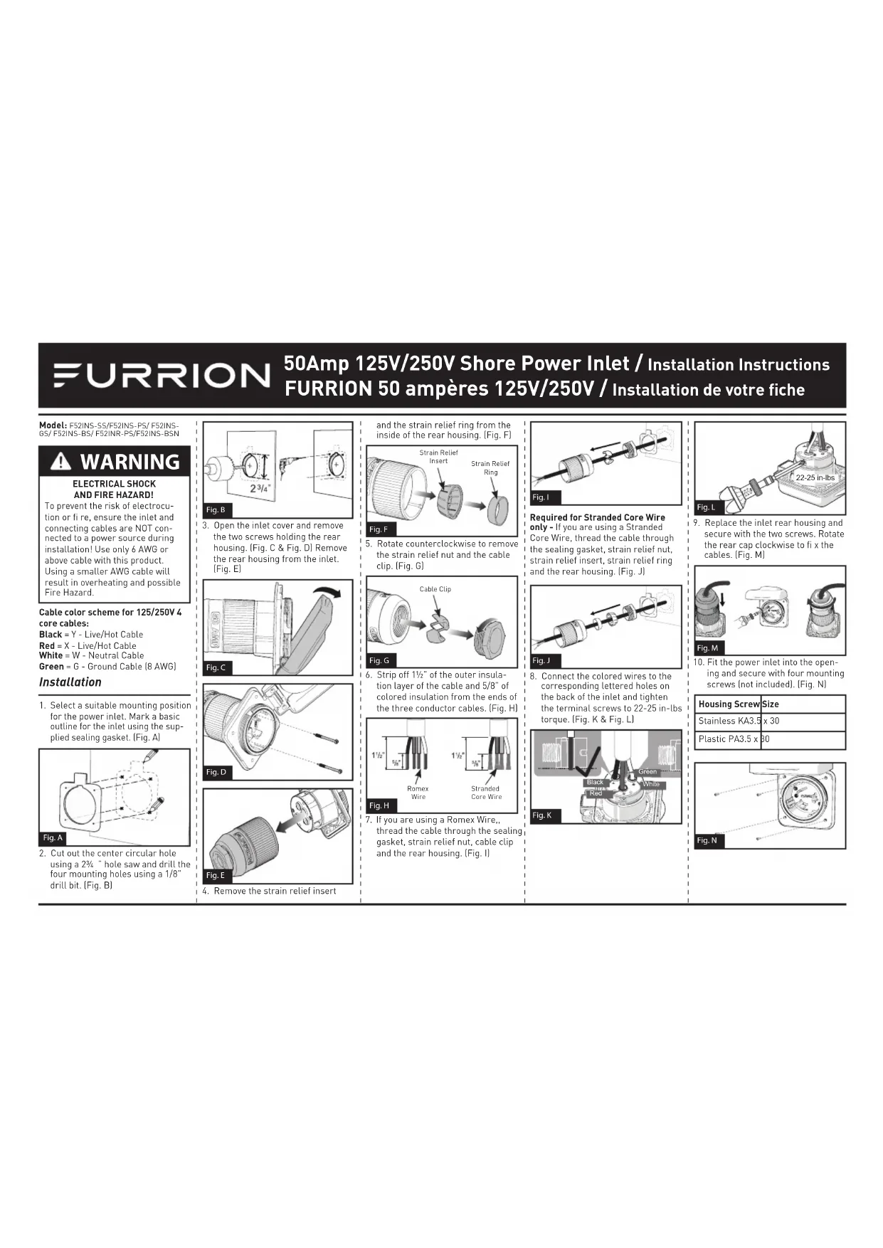 dans l'ouverture et le fi xer à l'aide de 4 vis de fi xation (Non inclus) (Fig. N) Boîtier Taille de la vis Inoxydable KA3.5 x 30 Plastique PA3.5 x 30 Fig. N Furrion Innovation Center & Institute of Technology ● 52567 Independence Ct., Elkhart, IN 46514, USA ● Toll free:1-888-354-5792 ● Email: support@furrion.com©2007-2018 Furrion Ltd. Furrion® and the Furrion logo are trademarks licensed for use by Furrion Ltd. and registered in the U.S. and other countries.©2007-2018 Furrion Ltd. Furrion® et le logo Furrion sont des marques déposées par Furrion Ltd. et enregis-trées aux Etats-Unis et ailleurs.FURRION.COM Modèle: F52INS-SS/F52INS-PS/ F52INS- GS/ F52INS-BS/ F52INR-PS/F52INS-BSN