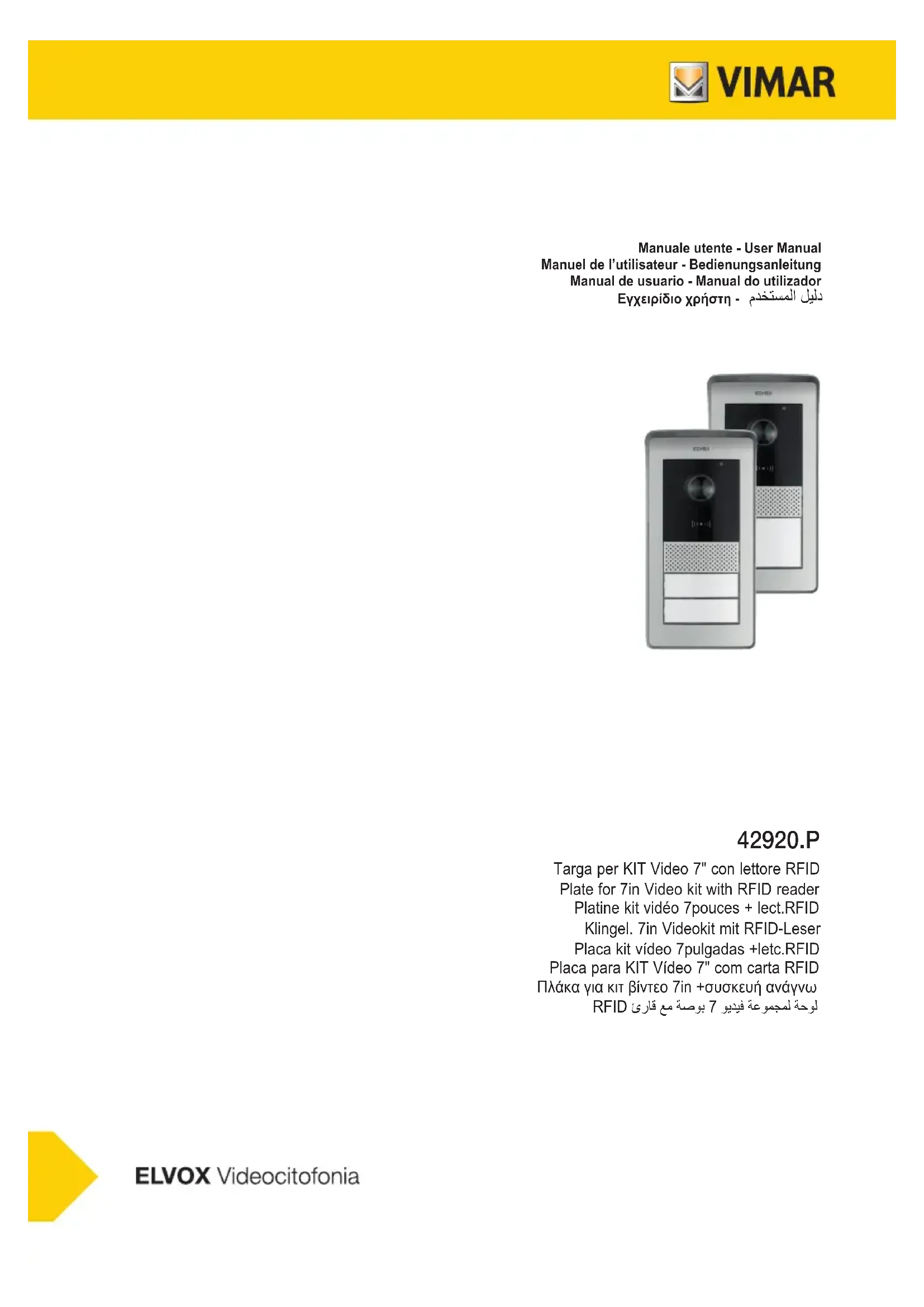 Téléchargez la notice de votre Interphone au format PDF gratuitement ! Retrouvez votre notice 42920.P - Vimar et reprennez votre appareil électronique en main. Sur cette page sont publiés tous les documents nécessaires à l'utilisation de votre appareil 42920.P de la marque Vimar.