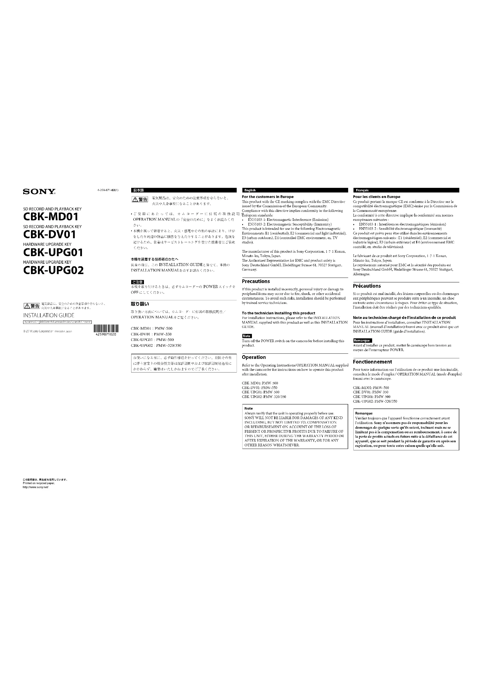 電気製品は、安全のための注意事項を守らないと、 火災や人身事故になることがあります。 INSTALLATION GUIDE Japanese/English/French/German/Italian/Spanish/Chinese © 2010 Sony Corporation Printed in JapanFrançaisPour les clients en EuropeCe produit portant la marque CE est conforme à la Directive sur la compatibilitéélectromagnétique(EMC)émiseparlaCommissiondela Communauté européenne.Laconformitéàcettedirectiveimpliquelaconformitéauxnormeseuropéennes suivantes :• EN55103-1:Interférencesélectromagnétiques(émission)• EN55103-2:Sensibilitéélectromagnétique(immunité)Ce produit est prévu pour être utilisé dans les environnements électromagnétiquessuivants:E1(résidentiel),E2(commercialetindustrielégère),E3(urbainextérieur)etE4(environnementEMCcontrôlé,ex.studiodetélévision).LefabricantdeceproduitestSonyCorporation,1-7-1Konan,Minato-ku,Tokyo,Japon.Le représentant autorisé pour EMC et la sécurité des produits est SonyDeutschlandGmbH,HedelngerStrasse61,70327Stuttgart,Allemagne. Précautions Siceproduitestmalinstallé,deslésionscorporellesoudesdommagesauxpériphériquespeuventseproduiresuiteàunincendie,unchocoutouteautrecirconstanceàrisques.Pourévitercetypedesituation,l’installationdoitêtreréaliséepardestechniciensqualiés.Note au technicien chargé de l’installation de ce produitPourlesinstructionsd’installation,consultezl’INSTALLATIONMANUAL(manueld’installation)fourniavecceproduitainsiquecetINSTALLATIONGUIDE(guided’installation).RemarqueAvantd’installerceproduit,mettezlecaméscopehorstensionaumoyen de l’interrupteur POWER. Fonctionnement Pourtouteinformationsurl’utilisationdeceproduitunefoisinstallé,consultezlemoded’emploi/OPERATIONMANUAL(moded’emploi)fourni avec le caméscope.CBK-MD01: PMW-500CBK-DV01: PMW-350CBK-UPG01: PMW-500CBK-UPG02: PMW-320/350RemarqueVérieztoujoursquel’appareilfonctionnecorrectementavantl’utilisation. Sony n’assumera pas de responsabilité pour les dommages de quelque sorte qu’ils soient, incluant mais ne se limitant pas à la compensation ou au remboursement, à cause de la perte de prots actuels ou futurs suite à la défaillance de cet appareil, que ce soit pendant la période de garantie ou après son expiration, ou pour toute autre raison quelle qu’elle soit.Deutsch Für Kunden in Europa Dieses Produkt besitzt die CE-Kennzeichnung und erfüllt die EMV- Richtlinie der EG-Kommission. Angewandte Normen: