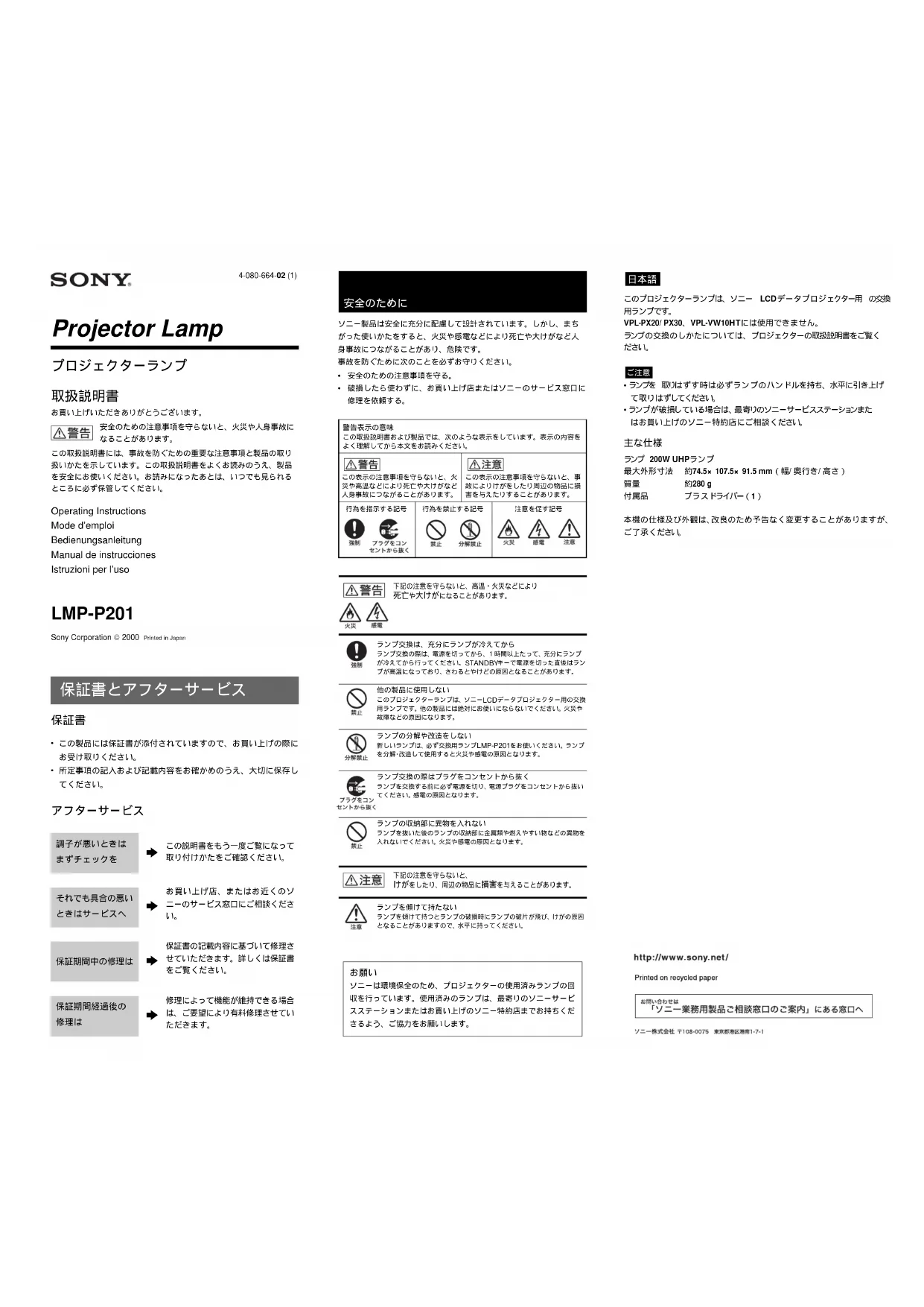 /8 inches) Mass Approx. 280 g (10 oz) Supplied accessory Philips screwdriver (1) Design and specifications are subject to change without notice. Français La lampe LMP-P201 est conçue pour être utilisée avec le projecteur de données LCD Sony. Cette lampe ne peut pas être utilisée avec le modèle VPL-PX20/PX30 ou VPL-VW10HT. Pour remplacer la lampe, reportez-vous au mode d’emploi du projecteur. Attentions