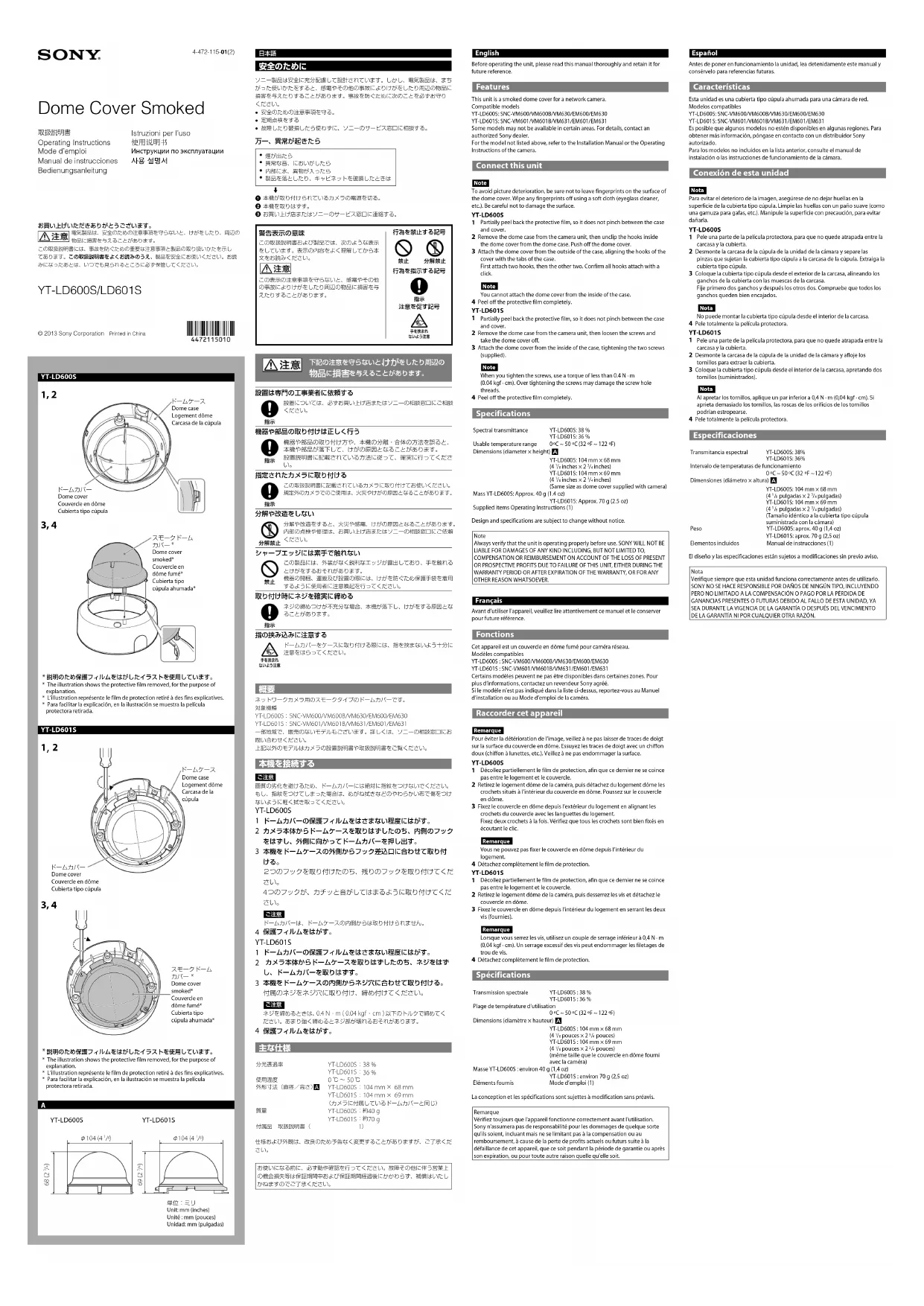 inches)(Same size as dome cover supplied with camera)Mass YT-LD600S: Approx. 40 g (1.4 oz)YT-LD601S: Approx. 70 g (2.5 oz)Supplied items Operating Instructions (1)Design and specifications are subject to change without notice. Note Always verify that the unit is operating properly before use. SONY WILL NOT BE LIABLE FOR DAMAGES OF ANY KIND INCLUDING, BUT NOT LIMITED TO,COMPENSATION OR REIMBURSEMENT ON ACCOUNT OF THE LOSS OF PRESENT OR PROSPECTIVE PROFITS DUE TO FAILURE OF THIS UNIT, EITHER DURING THE WARRANTY PERIOD OR AFTER EXPIRATION OF THE WARRANTY, OR FOR ANY OTHER REASON WHATSOEVER. Français Avant d’utiliser l’appareil, veuillez lire attentivement ce manuel et le conserver pour future référence. Fonctions Cet appareil est un couvercle en dôme fumé pour caméra réseau.Modèles compatiblesYT-LD600S : SNC-VM600/VM600B/VM630/EM600/EM630YT-LD601S : SNC-VM601/VM601B/VM631/EM601/EM631Certains modèles peuvent ne pas être disponibles dans certaines zones. Pour plus d’informations, contactez un revendeur Sony agréé.Si le modèle n’est pas indiqué dans la liste ci-dessus, reportez-vous au Manuel d’installation ou au Mode d’emploi de la caméra. Raccorder cet appareil RemarquePour éviter la détérioration de l’image, veillez à ne pas laisser de traces de doigt sur la surface du couvercle en dôme. Essuyez les traces de doigt avec un chiffon doux (chiffon à lunettes, etc.). Veillez à ne pas endommager la surface.YT-LD600S Décollez partiellement le film de protection, afin que ce dernier ne se coince pas entre le logement et le couvercle.2 Retirez le logement dôme de la caméra, puis détachez du logement dôme les crochets situés à l’intérieur du couvercle en dôme. Poussez sur le couvercle en dôme.3 Fixez le couvercle en dôme depuis l’extérieur du logement en alignant les crochets du couvercle avec les languettes du logement. Fixez deux crochets à la fois. Vérifiez que tous les crochets sont bien fixés en écoutant le clic.RemarqueVous ne pouvez pas fixer le couvercle en dôme depuis l’intérieur du logement.4 Détachez complètement le film de protection.YT-LD601S Décollez partiellement le film de protection, afin que ce dernier ne se coince pas entre le logement et le couvercle.2 Retirez le logement dôme de la caméra, puis desserrez les vis et détachez le couvercle en dôme.3 Fixez le couvercle en dôme depuis l’intérieur du logement en serrant les deux vis (fournies).RemarqueLorsque vous serrez les vis, utilisez un couple de serrage inférieur à 0,4 N ∙ m (0,04 kgf ∙ cm). Un serrage excessif des vis peut endommager les filetages de trou de vis.4 Détachez complètement le film de protection. Spécifications Transmission spectraleYT-LD600S : 38 %YT-LD601S : 36 %Plage de température d’utilisation0 ºC ~ 50 ºC (32 ºF ~ 122 ºF)Dimensions (diamètre × hauteur) YT-LD600S : 104 mm × 68 mm